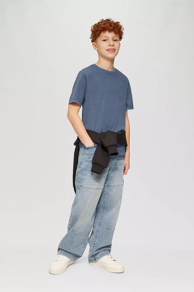 Футболка имеет классический крой с короткими рукавами и круглым вырезом горловины. Особенностью модели является слегка "помятый" эффект ткани, придающий ей более расслабленный и современный вид.