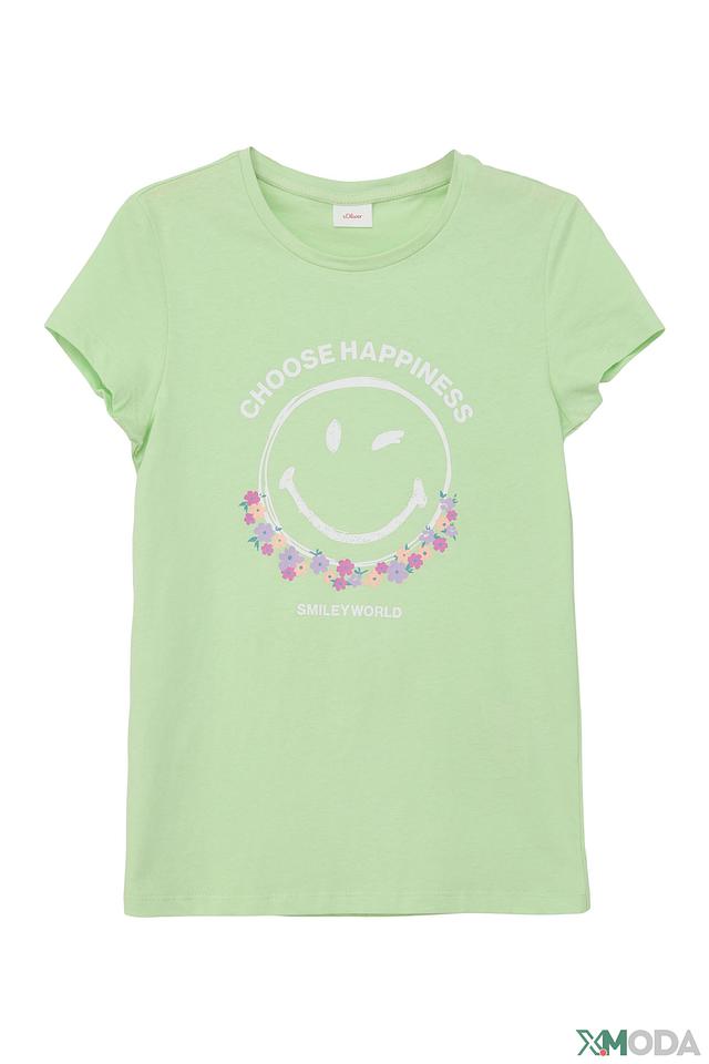 Светло-зелёная футболка s.Oliver для девочки с ярким принтом в виде улыбающегося смайлика. Изготовлена из 100% хлопка, обеспечивая комфорт и удобство в носке. Отличный выбор для повседневной носки. Состав: хлопок 100%