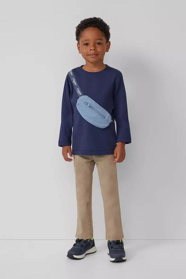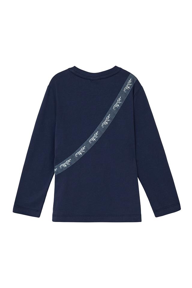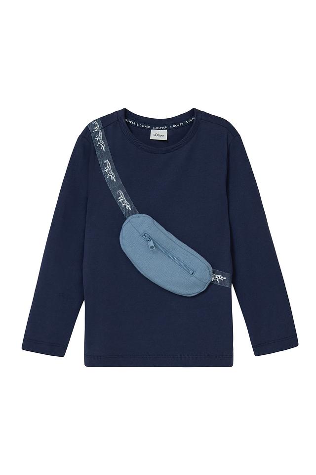 Синяя футболка s.Oliver из 100% хлопка с длинным рукавом и прикрепленной сумкой-бананкой. Удобный и стильный вариант для активных мальчиков. Состав: хлопок 100%