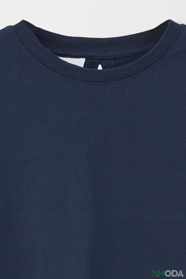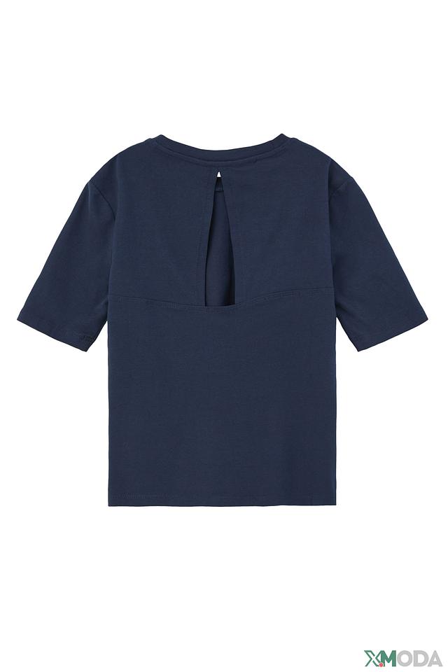 Футболка имеет классический крой, короткие рукава и круглый вырез горловины. Спинка футболки украшена небольшим V-образным вырезом. Благодаря простому дизайну, ее легко сочетать с другими элементами одежды, такими как джинсы, шорты или юбки.