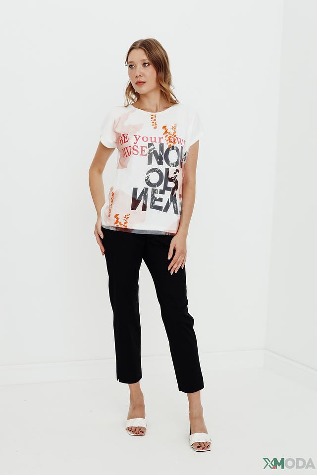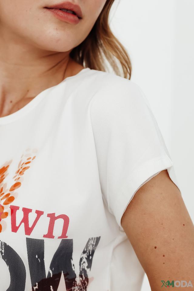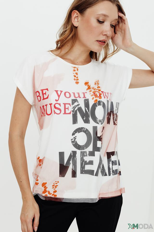 Футболка имеет свободный крой и короткие рукава-крылышки, что делает ее идеальной для теплой погоды. Главная особенность модели – яркий и запоминающийся принт с надписями и графическими элементами.