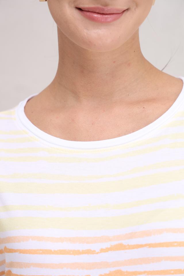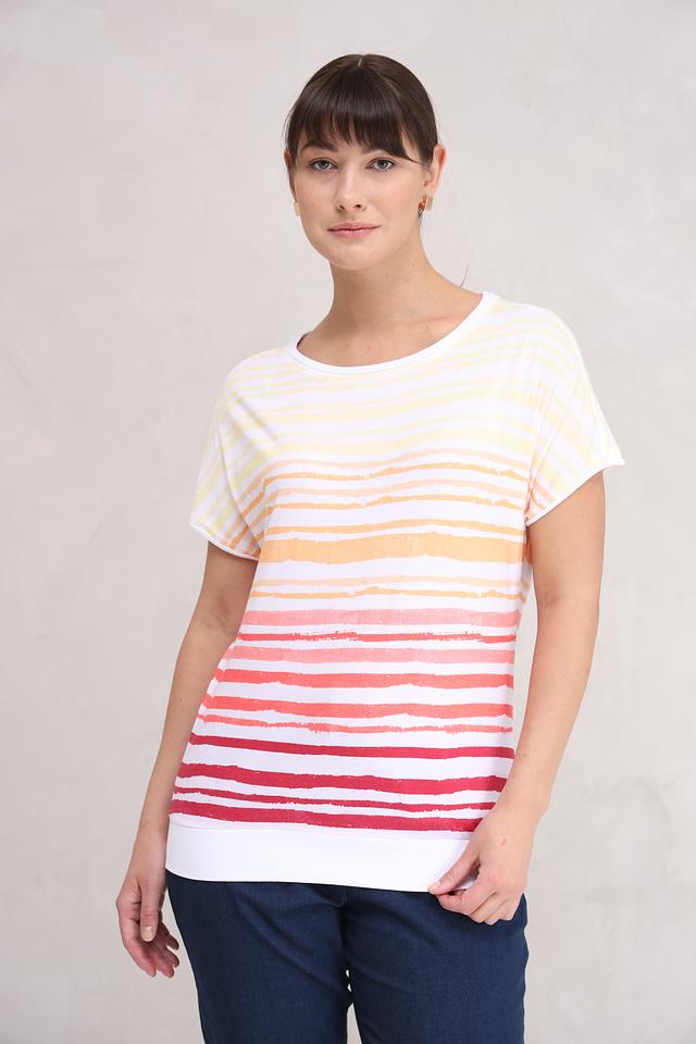 Футболка имеет свободный крой, который не сковывает движений и позволяет коже дышать. Оригинальный полосатый принт в сочетании нежных оттенков – от белого и бледно-жёлтого до персикового и розового – делает эту модель особенно привлекательной и универсальной.