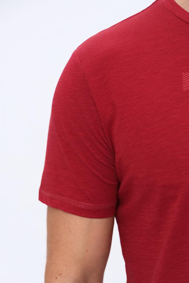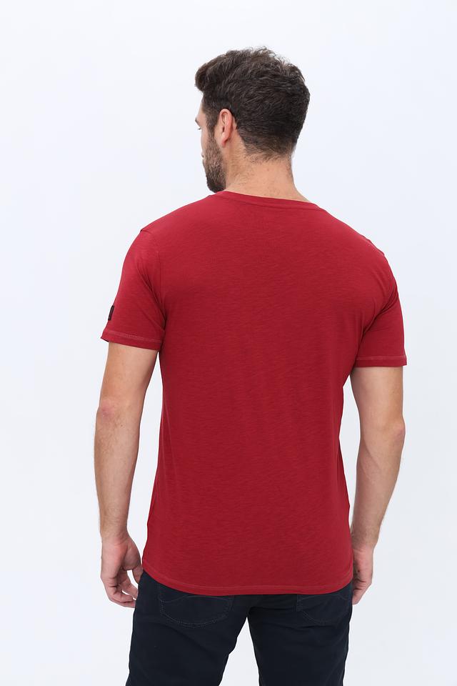 Бордовый цвет футболки выглядит насыщенно и благородно, легко сочетается с различными элементами одежды. Небольшая нашивка с логотипом бренда на рукаве добавляет оригинальности. Эта футболка идеально подойдет для создания повседневных образов, а также для занятий спортом или активного отдыха.