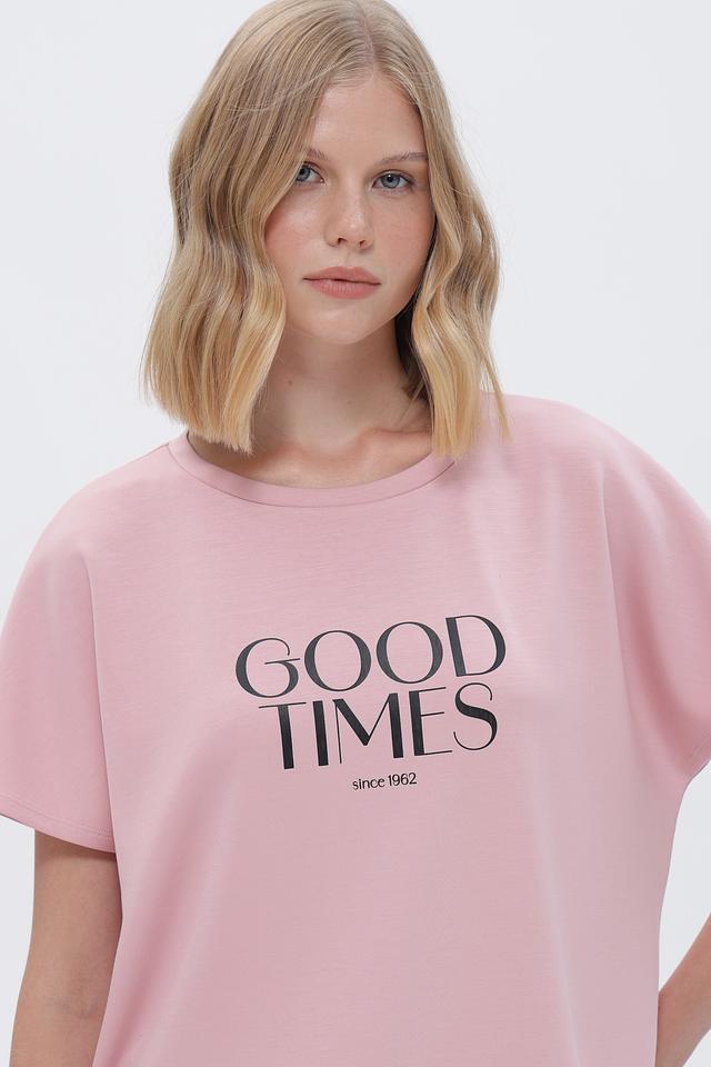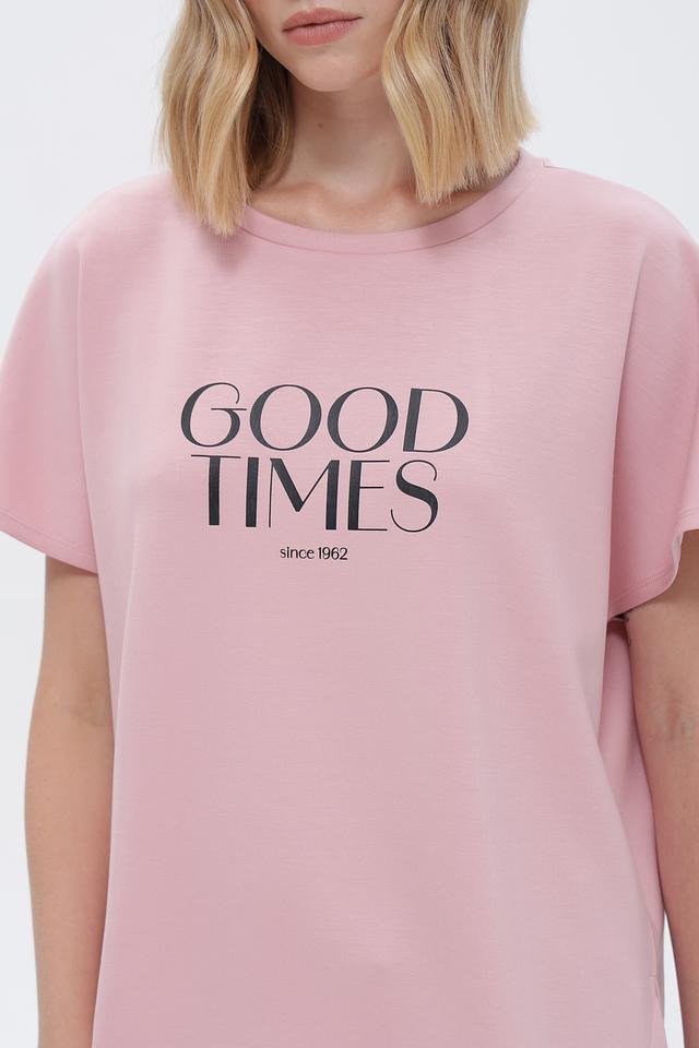 Футболка украшена крупным контрастным принтом “GOOD TIMES since 1962”, расположенным по центру. Вырез горловины — классический круглый. Короткие рукава делают модель подходящей для теплой погоды.