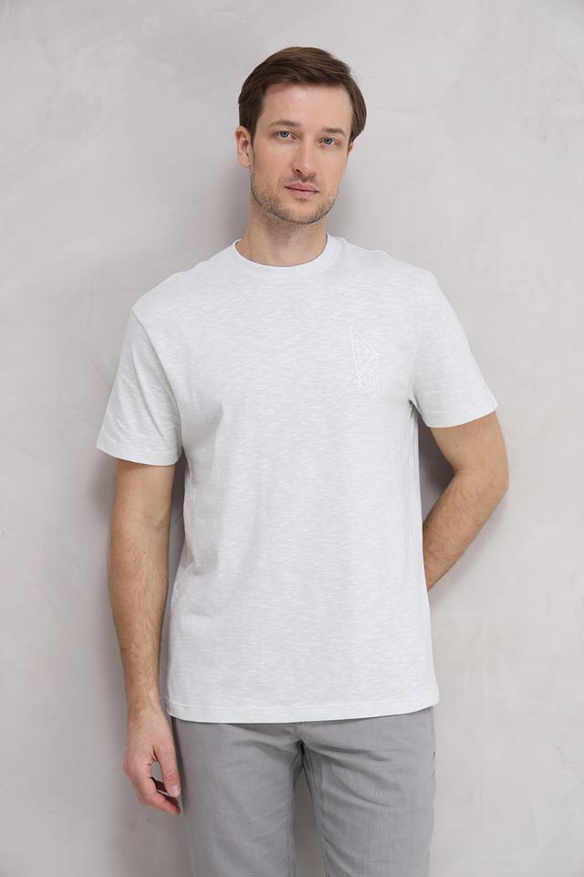 Модель имеет классический прямой крой, который обеспечивает свободу движений и комфортную посадку. Небольшой принт на груди добавляет футболке индивидуальности и стиля.