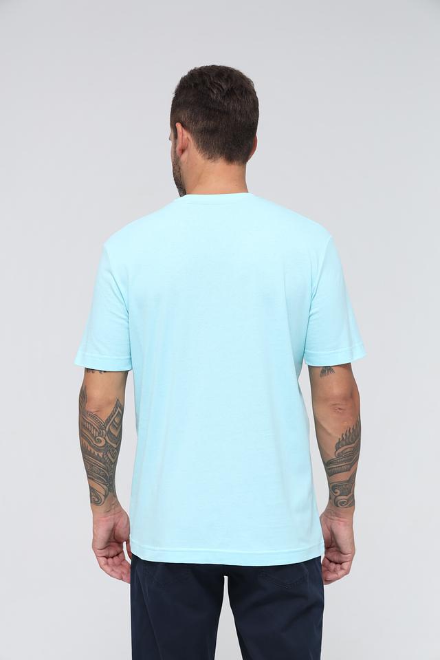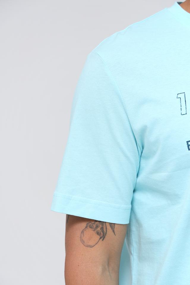 Эта футболка от Tom Tailor станет отличным дополнением к вашему гардеробу. Она выполнена в нежном голубом цвете и украшена эффектным принтом "Pacific Paradise", включающим в себя изображение пальмовых листьев, надписи и графические элементы.