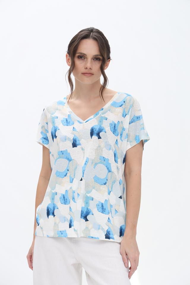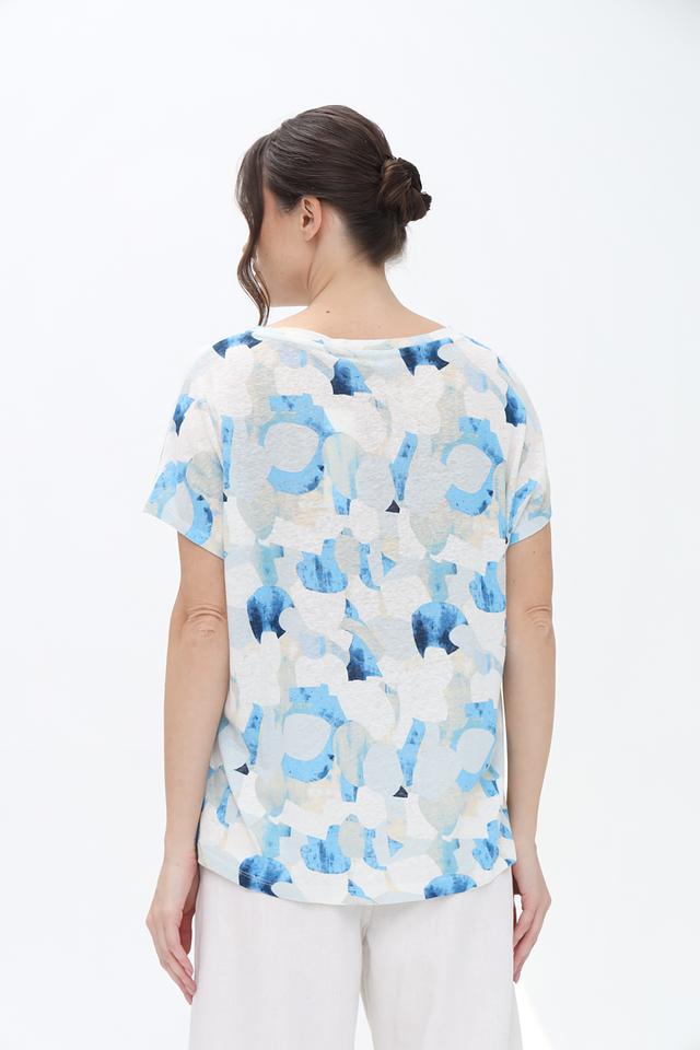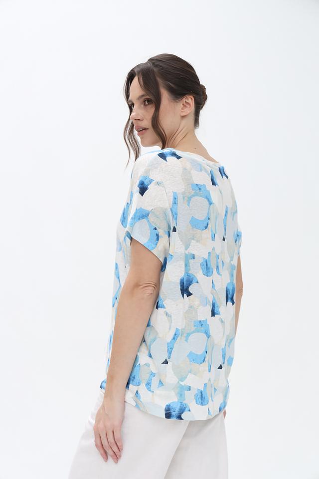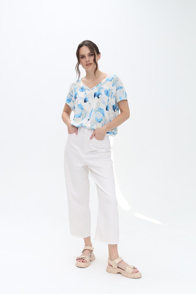 Особенностью данной модели является оригинальный абстрактный принт в голубых и белых тонах, который придаёт ей неповторимый вид. V-образный вырез горловины и короткие рукава делают футболку универсальной и подходящей для различных образов.