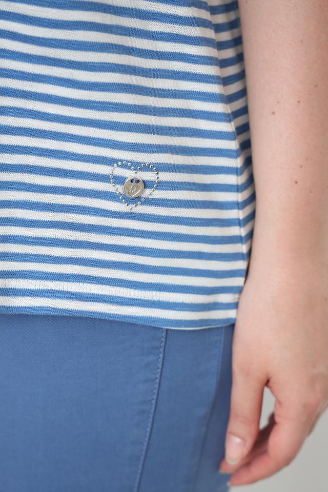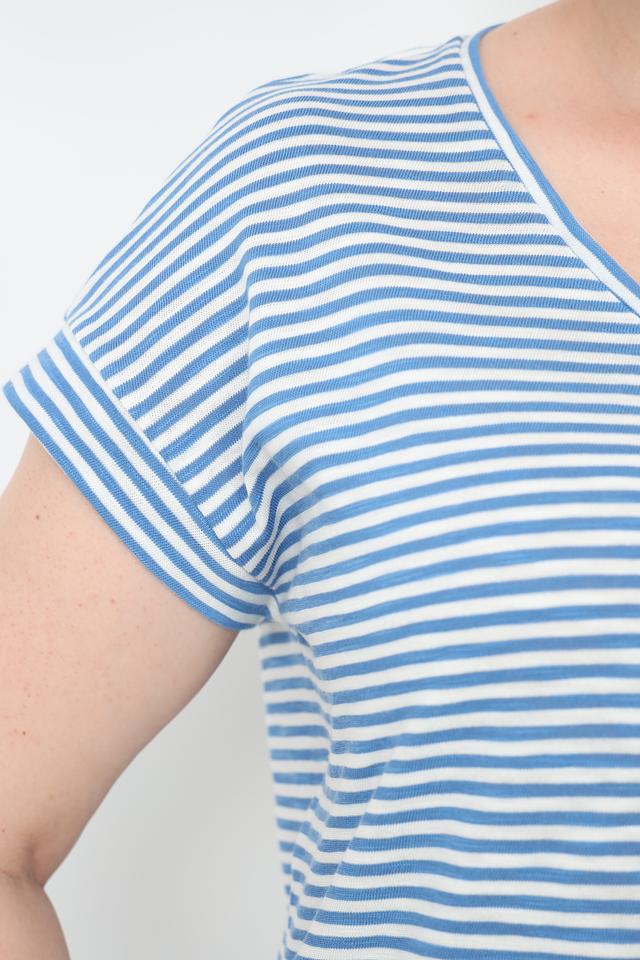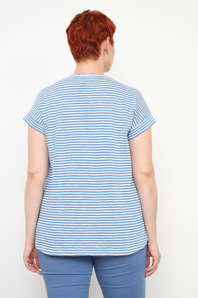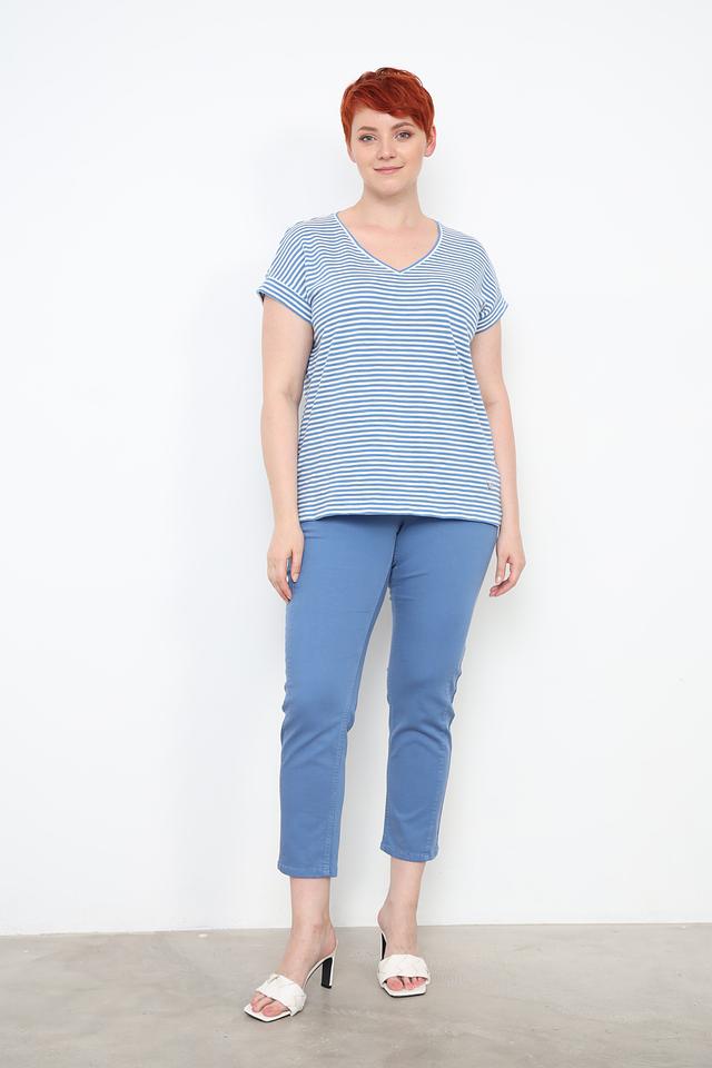 Женская футболка Frapp голубого цвета в белую полоску – это стильная и комфортная модель на каждый день. Футболка имеет V-образный вырез и короткий рукав с манжетами. Изготовлена из 100% хлопка. Состав: хлопок 100%