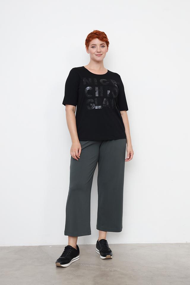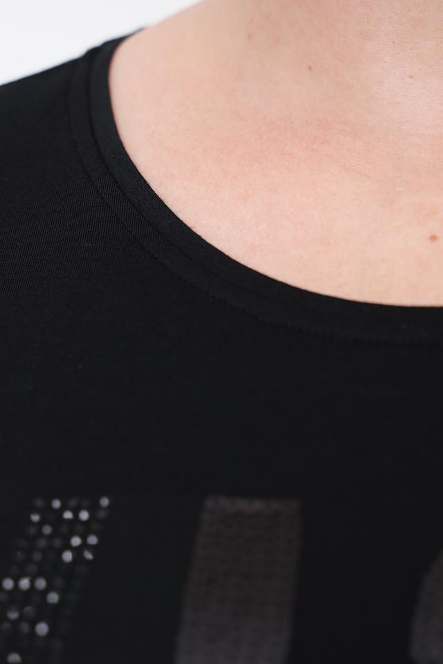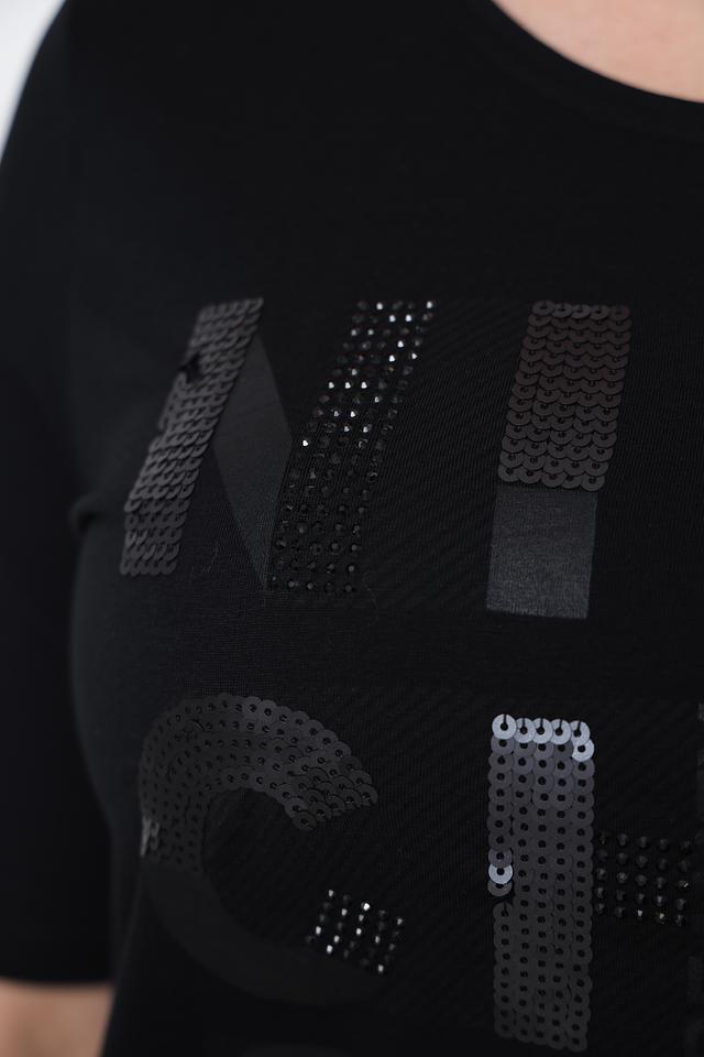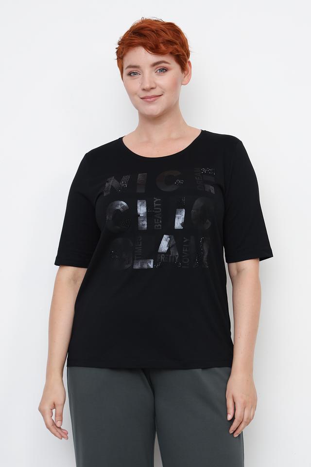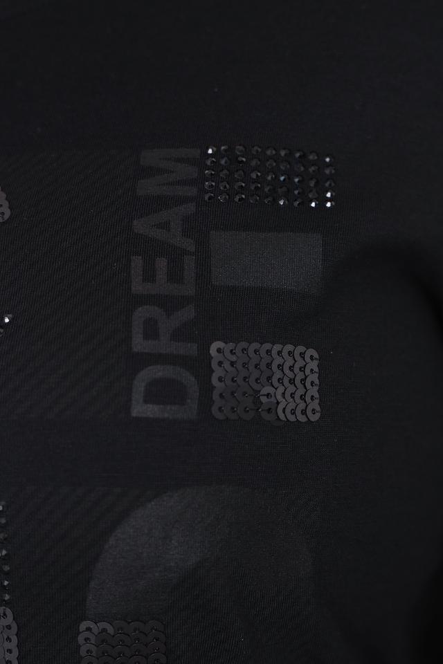 Черная футболка Via Appia DUE женского кроя с оригинальным принтом. Изготовлена из мягкого и приятного к телу сочетания хлопка и модала, обеспечивающего комфорт в носке. Стильный и универсальный вариант для повседневного образа. Состав: хлопок 47%, модал 47%, эластан 6%