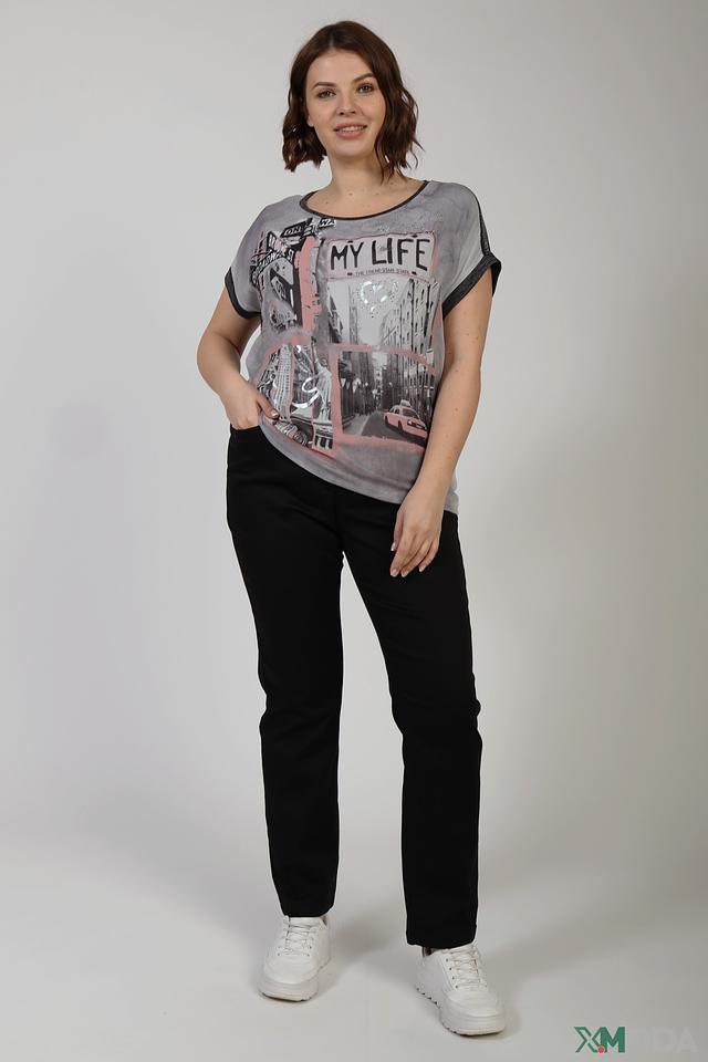 Женская футболка Via Appia серого цвета с ярким принтом "My Life" в стиле city. Модель свободного кроя с короткими рукавами и декоративной отделкой на плечах. Состав: полиэстер 93%, эластан 7%