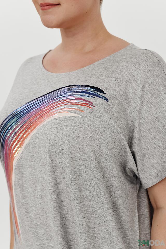 Основной цвет футболки – серый меланж, который легко сочетается с другими элементами одежды. Главная деталь – яркий принт в виде радуги, расположенный на передней части изделия. Футболка имеет свободный крой и короткие рукава.