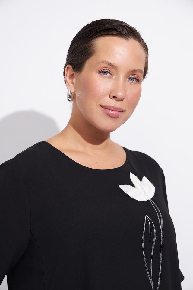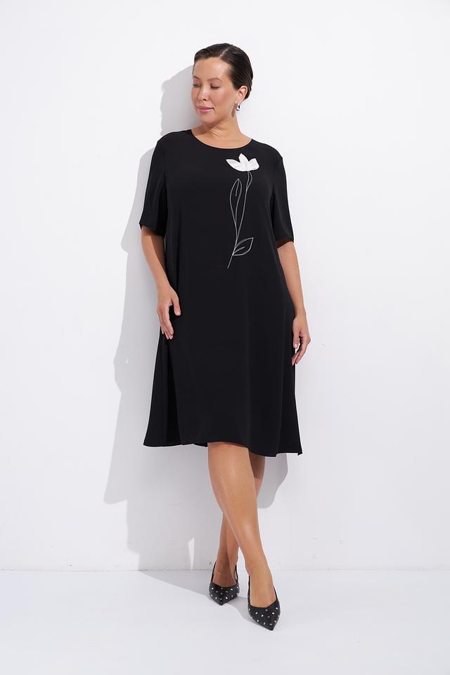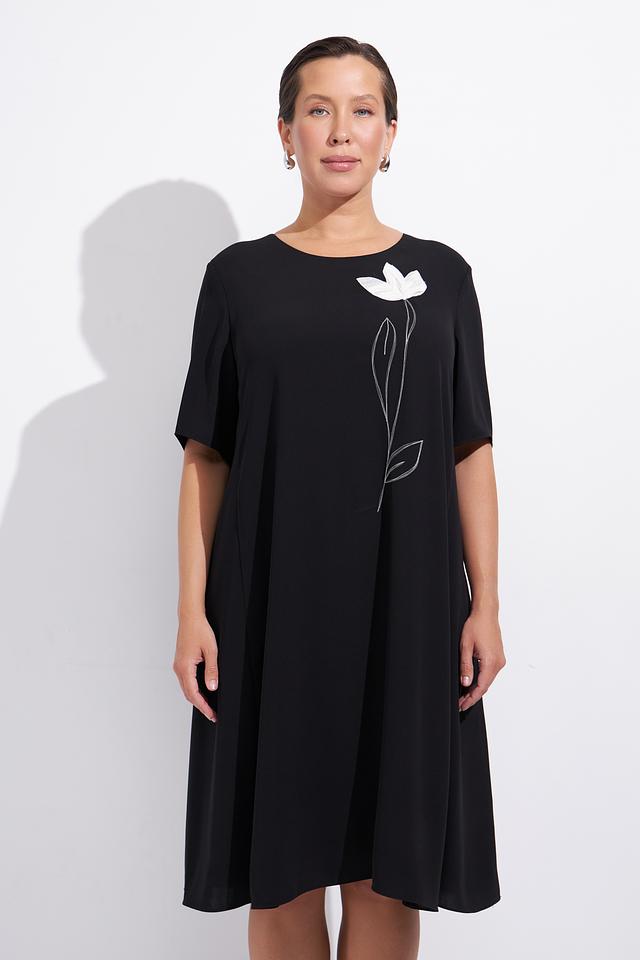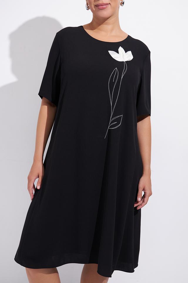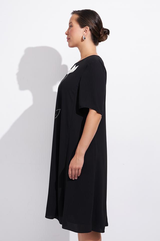 Особенностью этого платья является оригинальный цветочный принт белого цвета, который эффектно выделяется на чёрном фоне. Декоративный элемент в виде стилизованного цветка добавляет платью изысканности и индивидуальности.