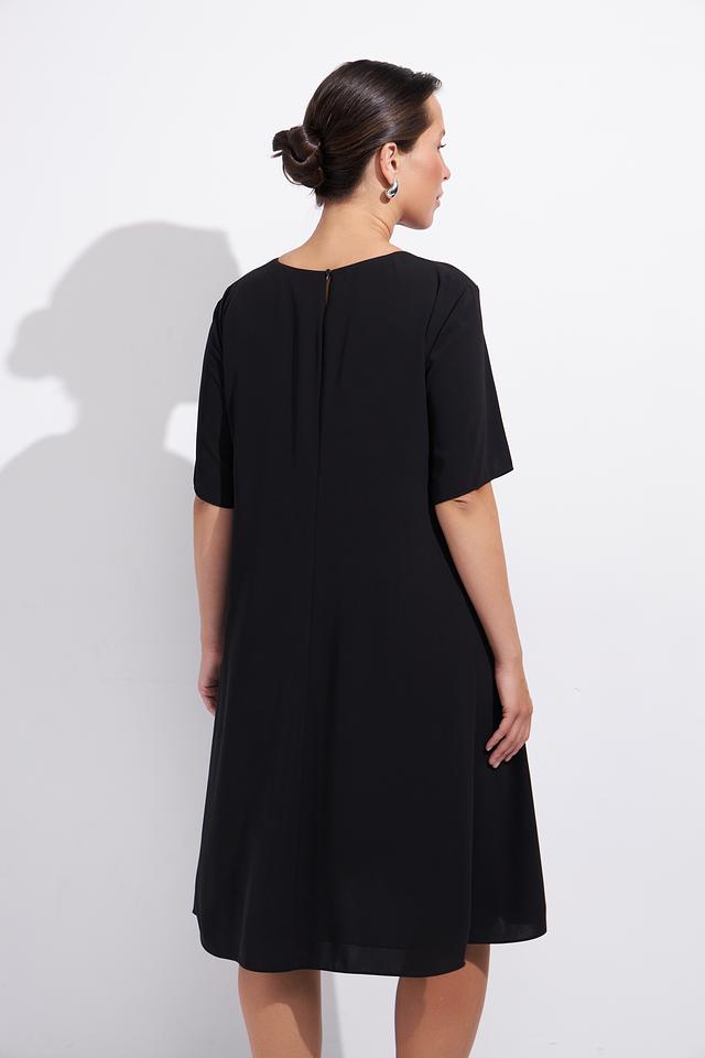 Платье имеет прямой, слегка расклешённый силуэт, который обеспечивает свободу движений и комфортную посадку по фигуре. Короткие рукава и округлый вырез горловины добавляют образу лёгкости и женственности.