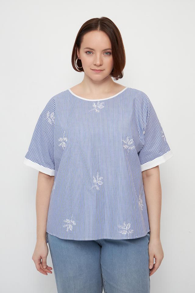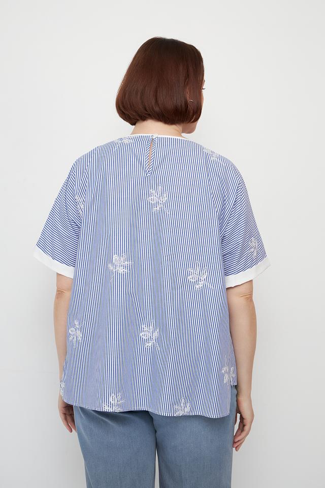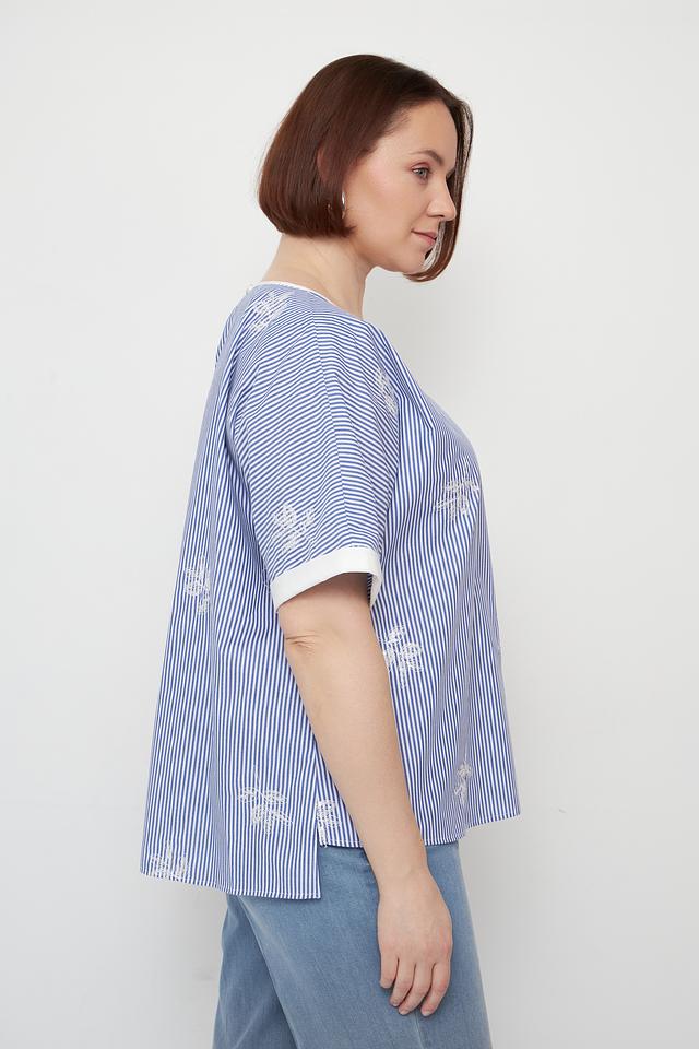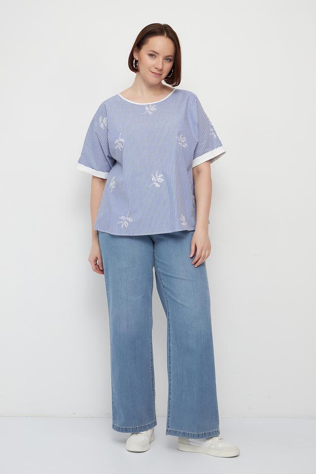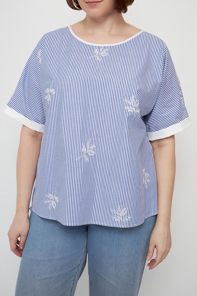 Блуза Gaia голубого цвета в белую полоску украшена нежной цветочной вышивкой. Модель свободного кроя с короткими рукавами и округлым вырезом горловины выполнена из 100% хлопка, что обеспечивает комфорт в носке. Состав: хлопок 100%