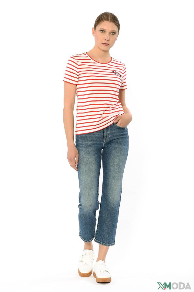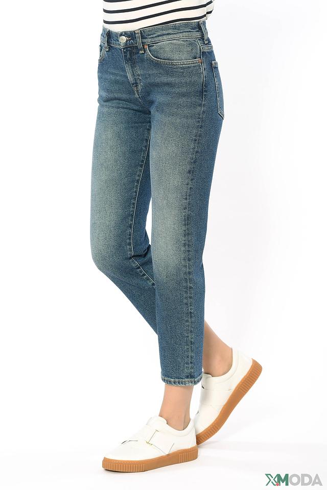 Брюки выполнены из денима, который обеспечивает комфорт и долговечность. Завышенная талия подчеркивает фигуру и создает элегантный силуэт. Эффект потертости придает брюкам современный и непринужденный вид.