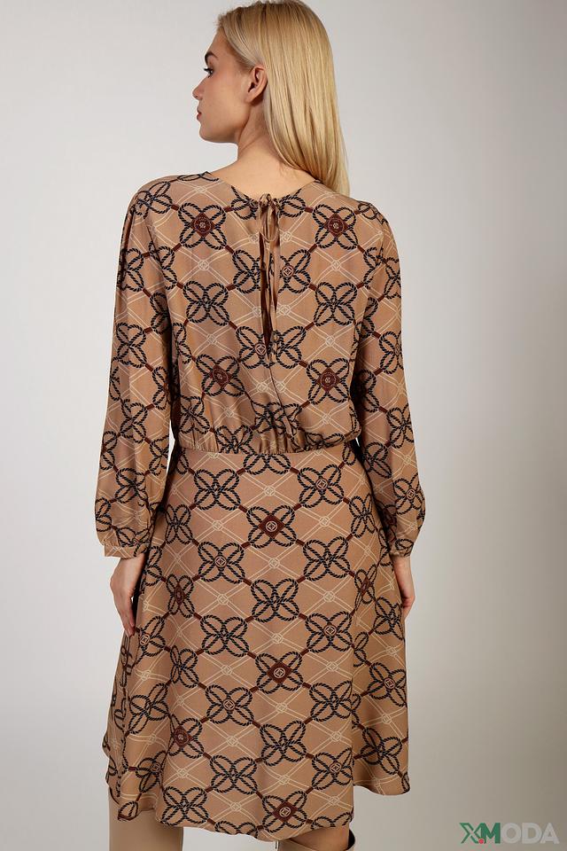 Модель имеет длину миди, длинные рукава и округлый вырез горловины. Главной особенностью платья является оригинальный принт в клетку, выполненный в бежево-коричневой гамме. Талия слегка приталена и подчеркнута сборкой, что придает платью женственный силуэт.