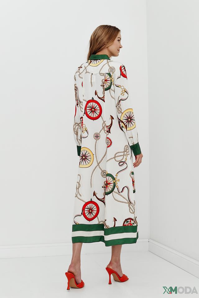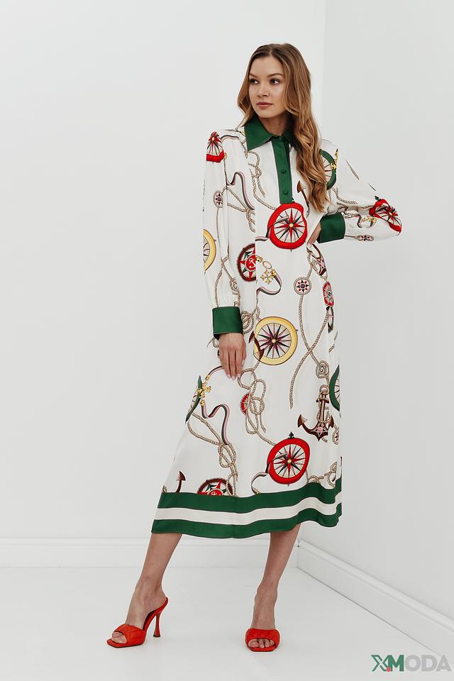 Модель имеет рубашечный крой с воротником и застёжкой на пуговицы. Зелёная отделка по краю воротника, манжетам рукавов и нижнему краю платья добавляет контрастности и свежести образу. Рукава длинные, слегка расклешенные к низу.