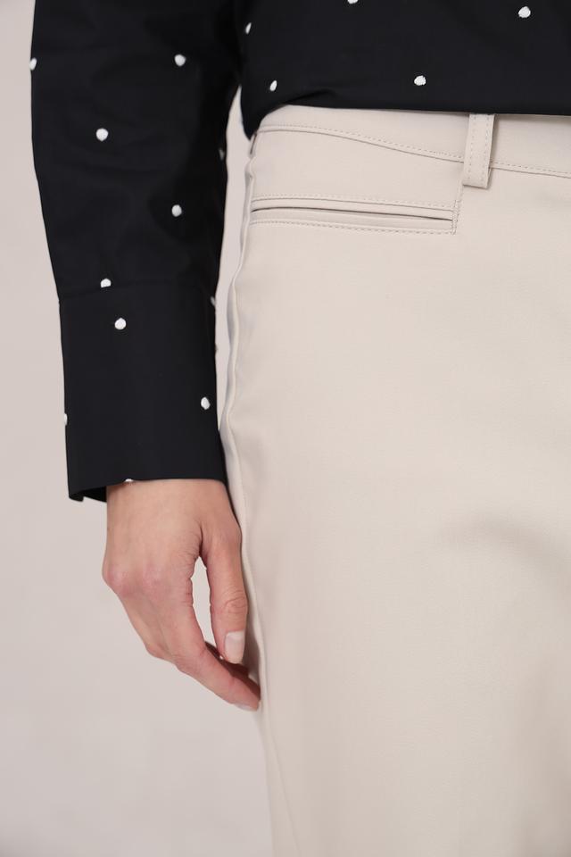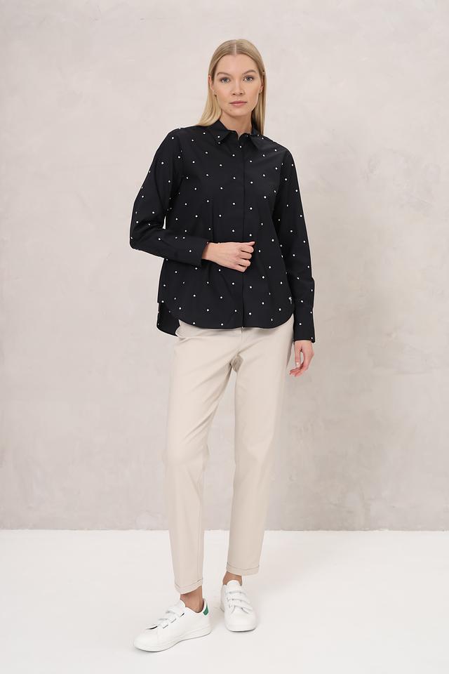 Застежка на молнию и пуговицу, боковые карманы. Задние карманы с декоративной отделкой. Прямой крой и умеренная посадка делают эти брюки универсальными и подходящими для разных типов фигуры.