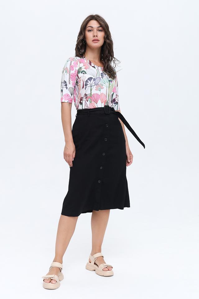 Юбка имеет длину миди и прямой крой, что обеспечивает комфортную посадку. Застёжка на пуговицы спереди добавляет изюминку в дизайн. Съёмный пояс позволяет подчеркнуть талию и создать более женственный силуэт.