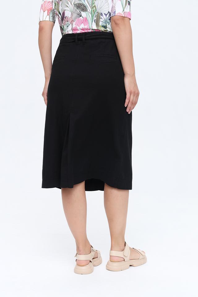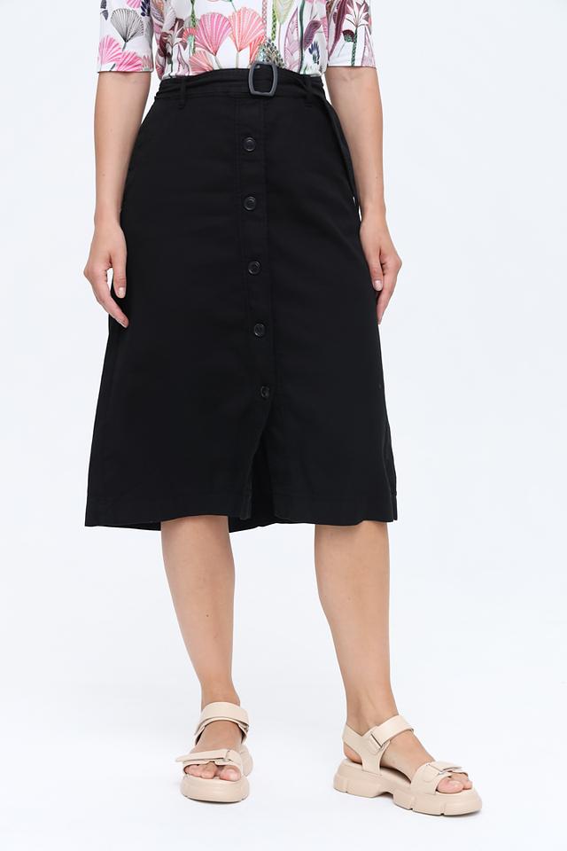 Чёрная юбка Gardeur длиной миди выполнена из льна с хлопком и эластаном. Модель с застёжкой на пуговицы и съёмным поясом. Состав: лен 53%, хлопок 44%, эластан 3%