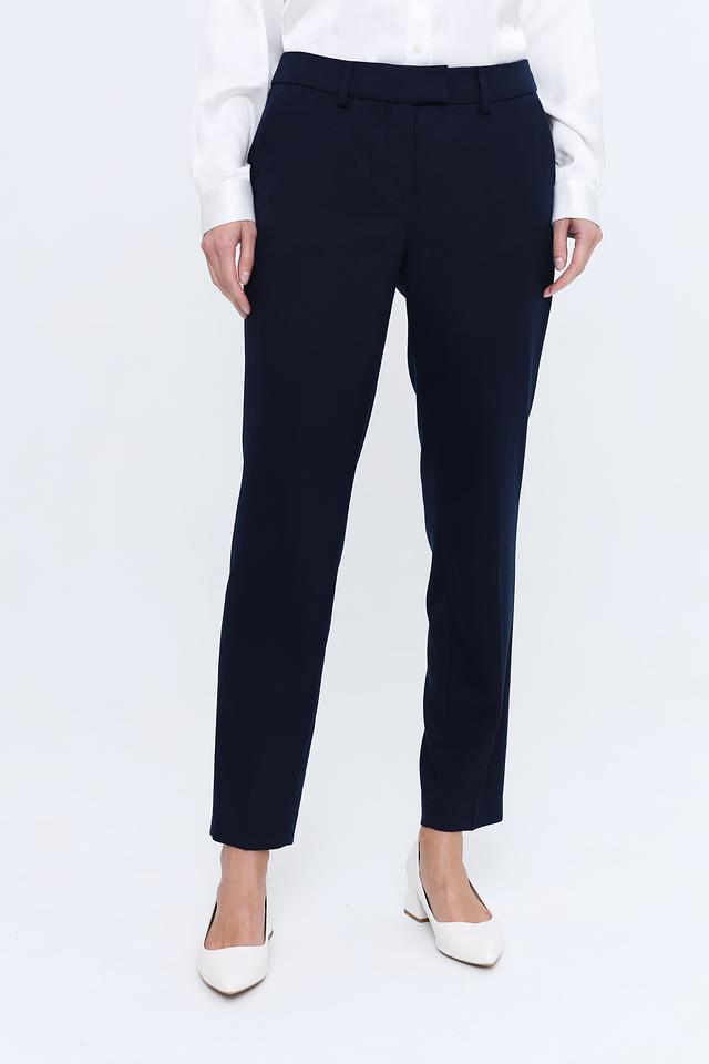 Брюки имеют прямой крой, стандартную посадку по талии и застежку на молнию с пуговицей. Ткань состоит из полиэстера (63%), вискозы (34%) и эластана (3%), что обеспечивает комфорт в носке, хорошую посадку и устойчивость к сминанию.