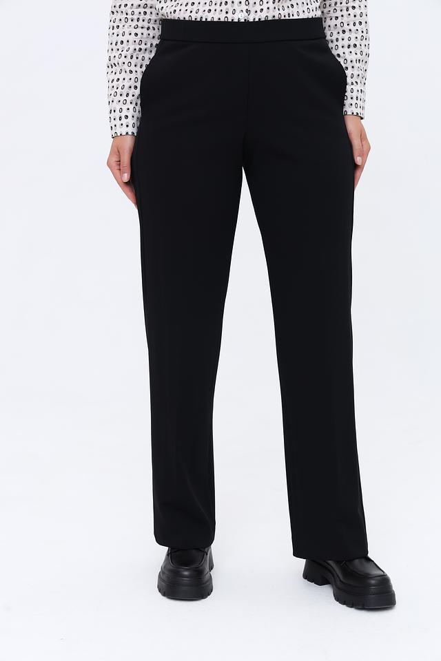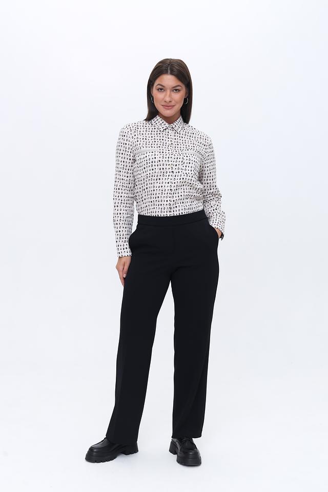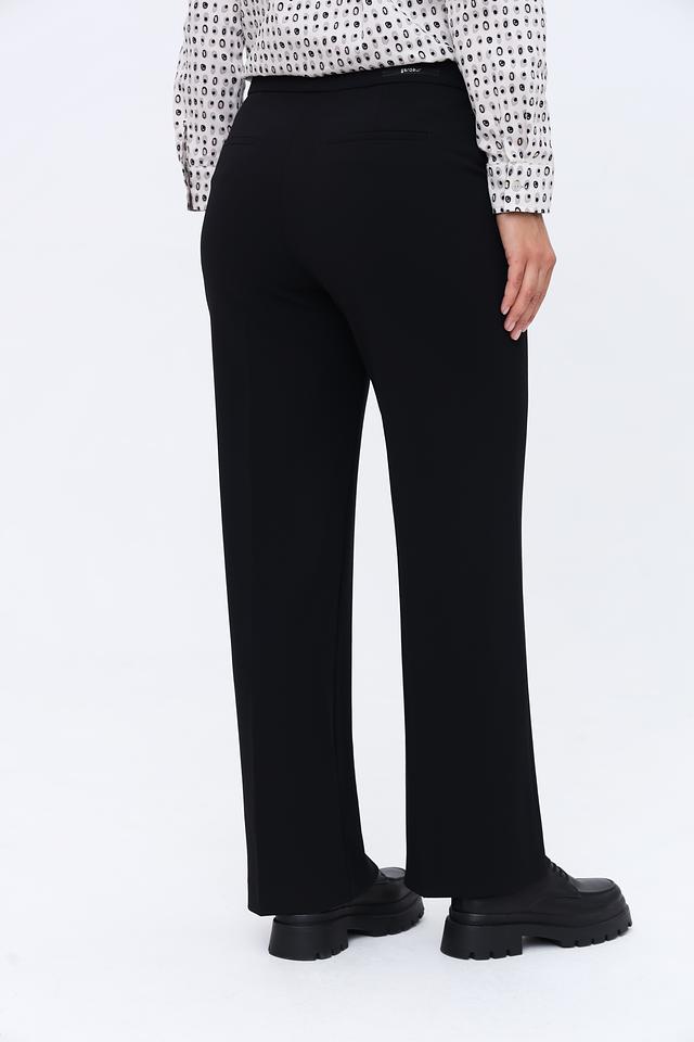 Брюки имеют прямой крой, обеспечивающий комфортную посадку и свободу движений. Высокая посадка подчеркивает талию и визуально удлиняет ноги. Ткань, состоящая из полиэстера и эластана, приятна на ощупь и обеспечивает хорошую износостойкость.