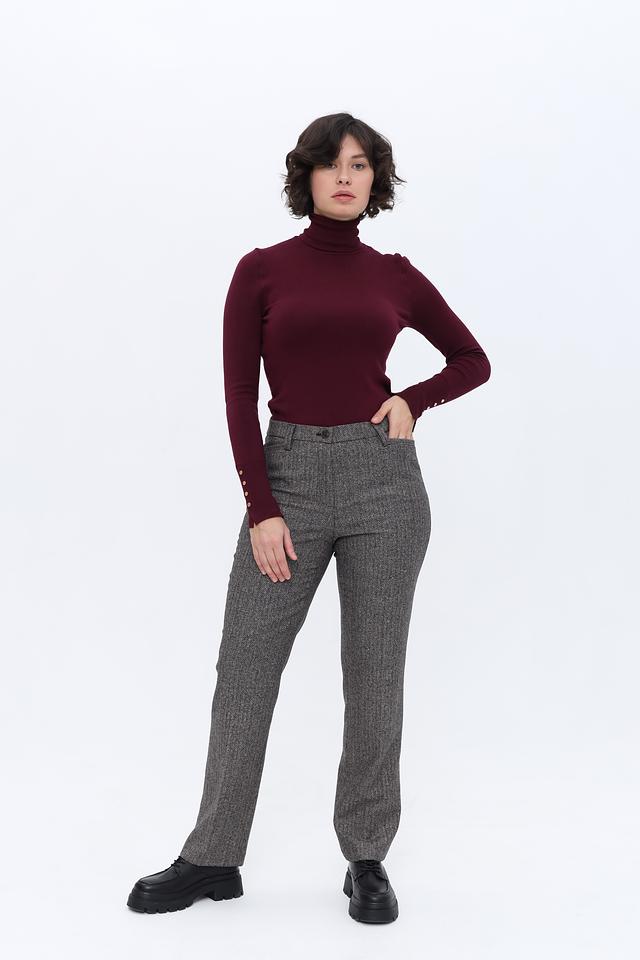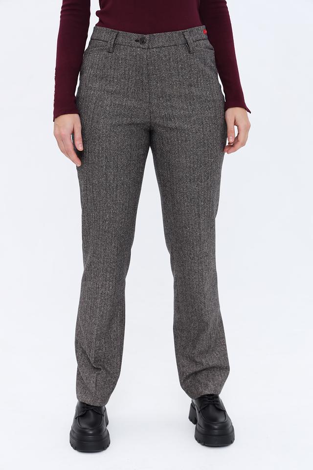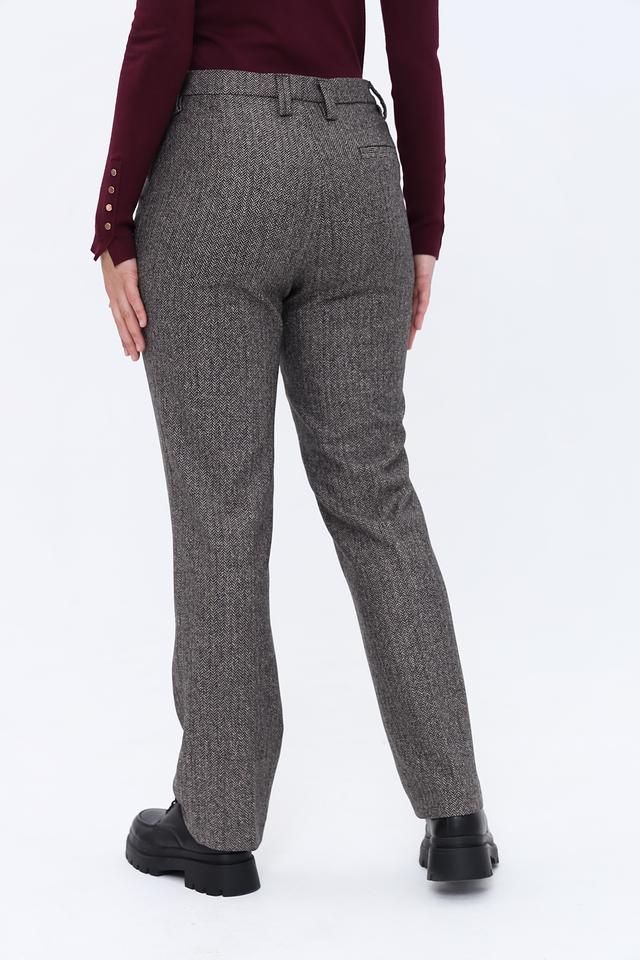 Крой брюк предполагает прямую посадку по фигуре и слегка расклешенный книзу силуэт. Застежка на молнию и пуговицу, а также наличие задних карманов с клапанами добавляют функциональности и стиля. Данная модель станет прекрасным выбором для создания делового или повседневного образа.