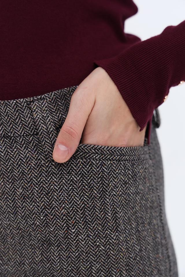 Брюки имеют серый цвет с характерным рисунком "принц Уэльский", который придает им особый шарм. Ткань состоит из 50% шерсти, 29% полиэстера, 20% хлопка и 1% эластана, что обеспечивает комфорт в носке и сохранение формы.