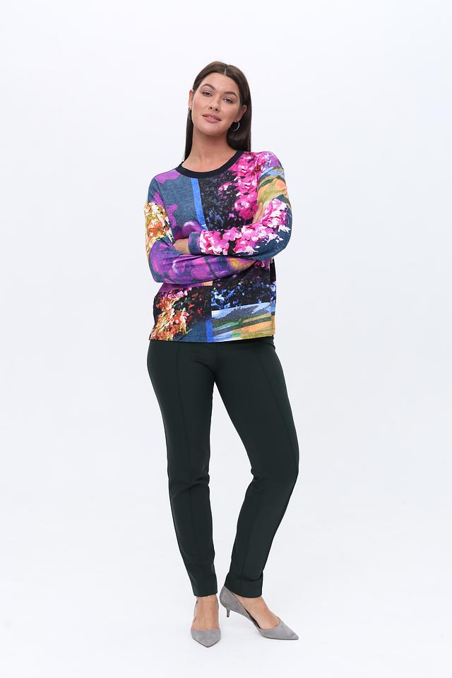 Брюки имеют прямой крой и высокую посадку, что визуально удлиняет ноги и подчеркивает талию. Передняя часть брюк оформлена аккуратными вертикальными вытачками, придающими им более изысканный вид. Застежка – молния и пуговица.
