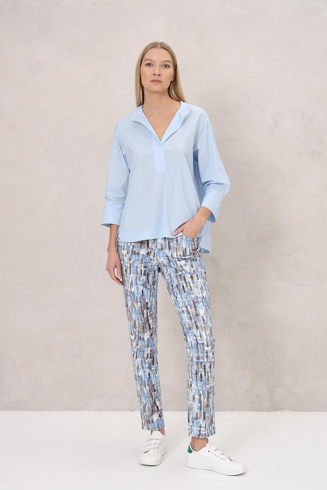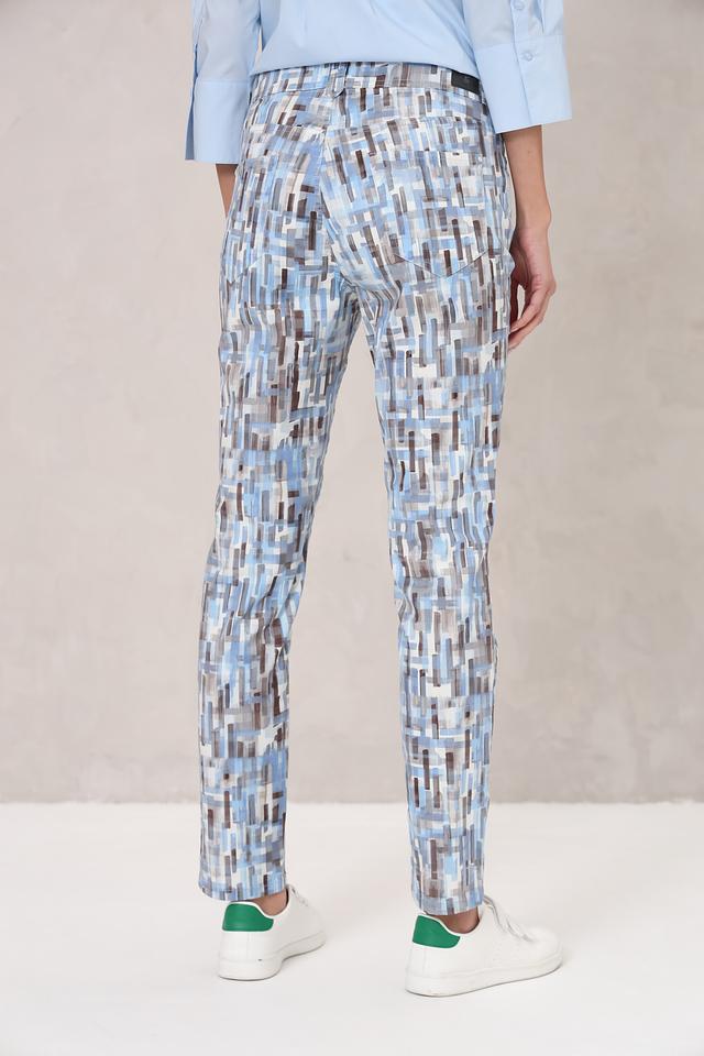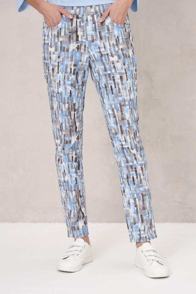 Женские брюки Gardeur голубого цвета с оригинальным геометрическим принтом. Модель выполнена из хлопка с добавлением эластана для комфорта и свободы движений. Состав: хлопок 97%, эластан 3%
