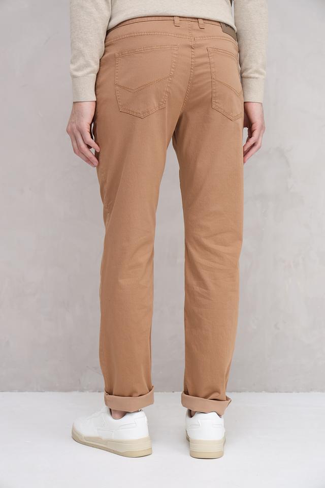 Брюки выполнены из высококачественного хлопка с добавлением эластана, что придает им мягкость, комфорт и небольшую эластичность. Цвет брюк – насыщенный коричневый, который легко сочетается с различными элементами гардероба.