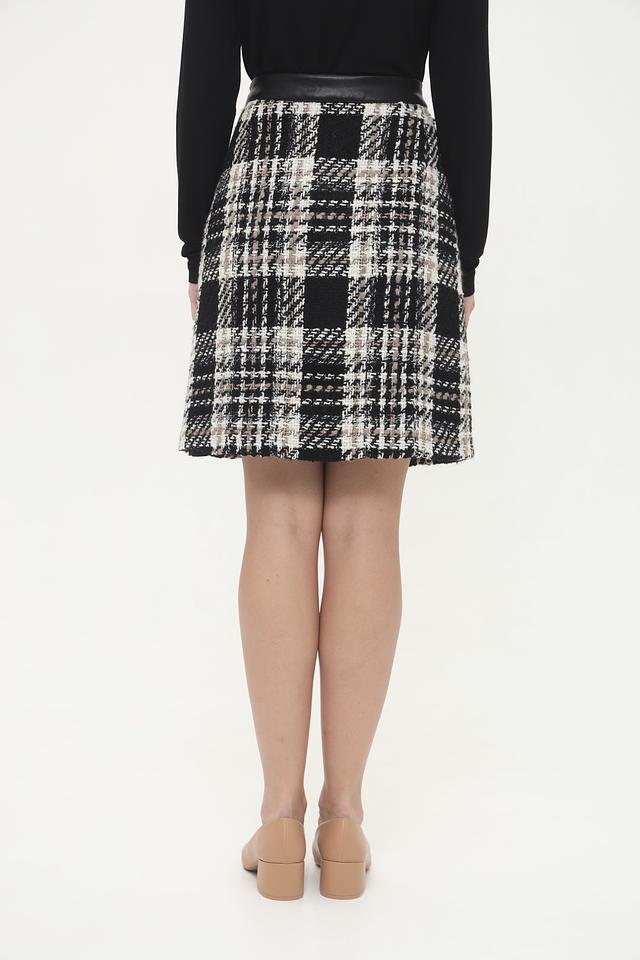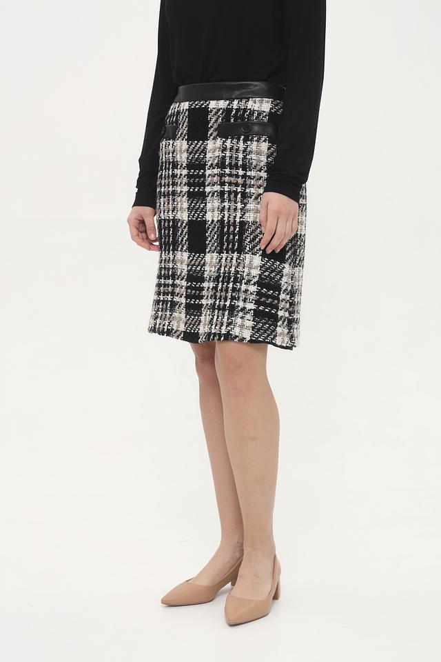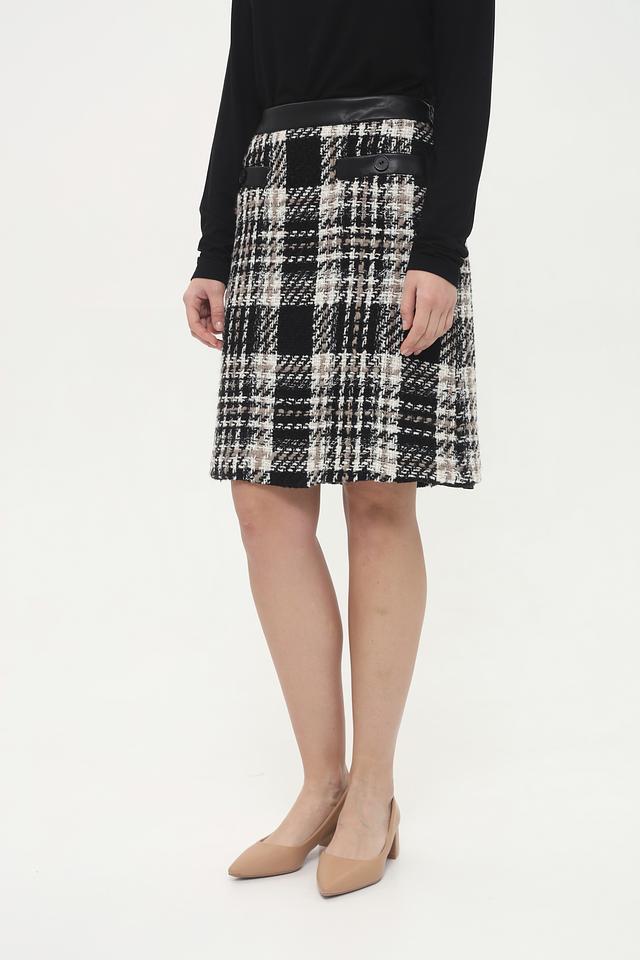 Юбка Gardeur чёрно-бежевого цвета с классическим клетчатым принтом и кожаной отделкой на поясе. Модель выполнена из твидовой ткани, что придает ей элегантный и стильный вид. Состав: полиакрил 51%, шерсть 28%, полиэстер 16%, полиамид 3%, эластан 2%