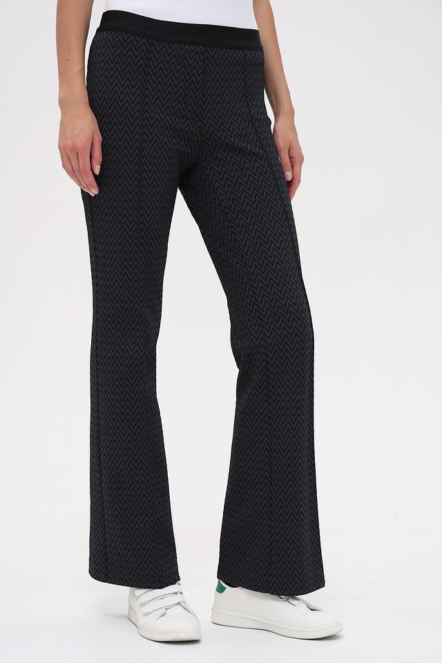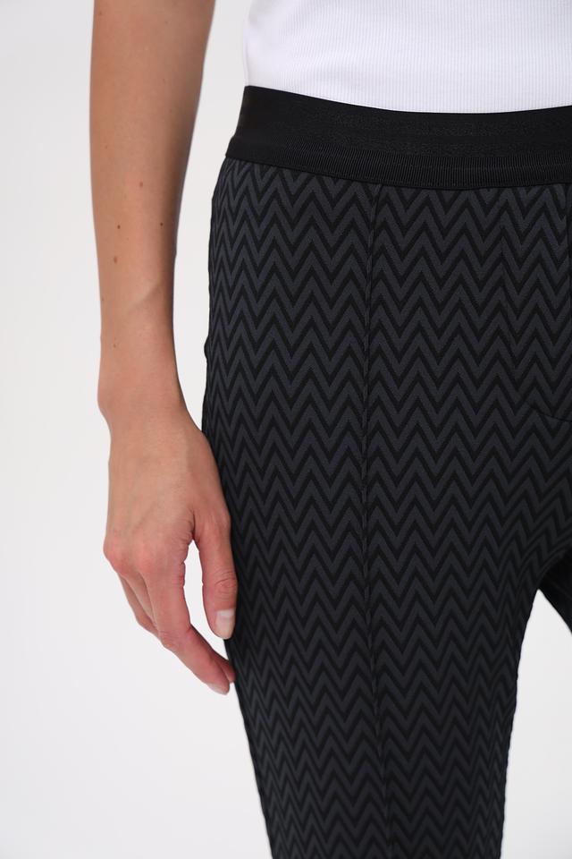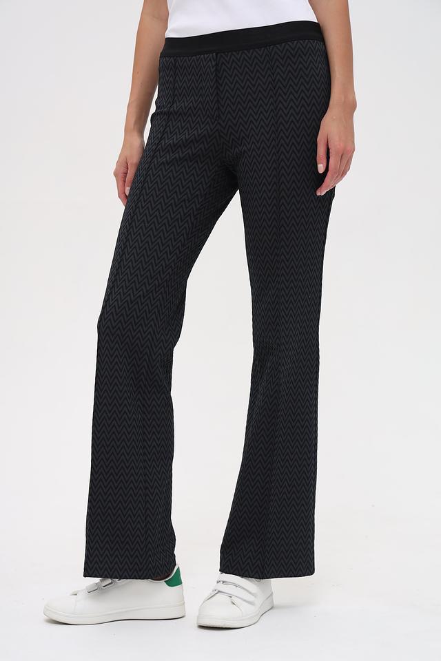 Женские брюки Gardeur чёрного цвета с оригинальным геометрическим узором зигзаг. Модель выполнена из эластичного материала с высокой посадкой и слегка расклешенным силуэтом, обеспечивающим комфорт и свободу движений. Состав: полиамид 98%, эластан 2%