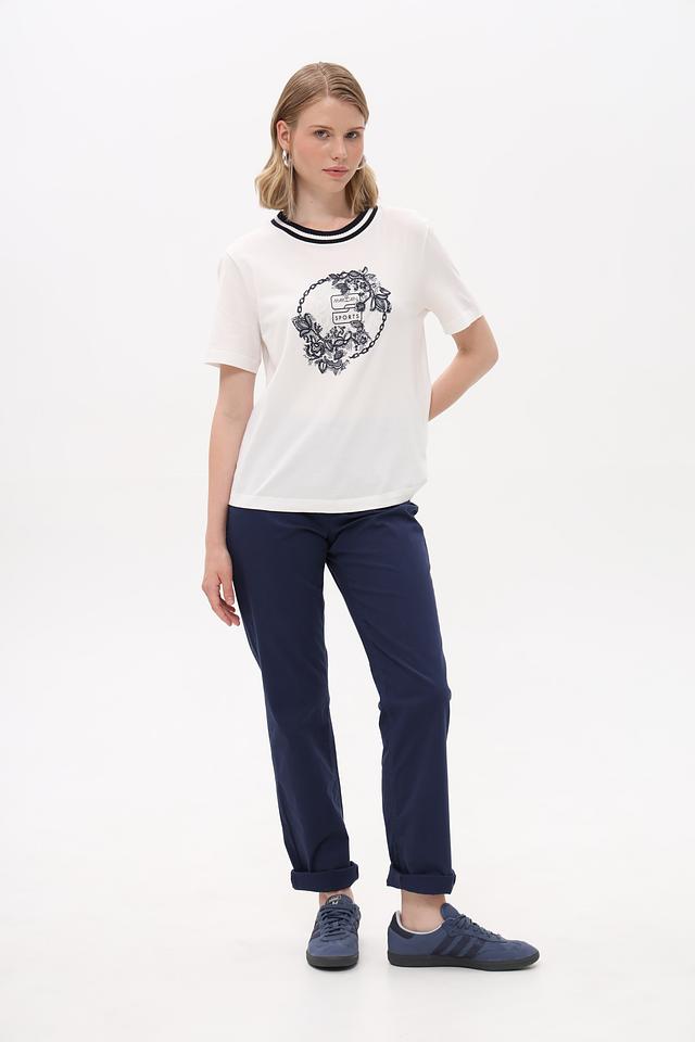 Брюки изготовлены из высококачественного хлопка с добавлением эластана, что обеспечивает комфорт в носке и сохранение формы. Застежка на пуговицу, пояс со шлевками для ремня. Боковые карманы и два задних накладных кармана.