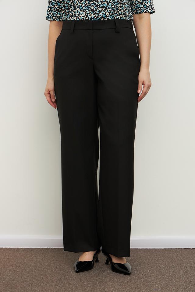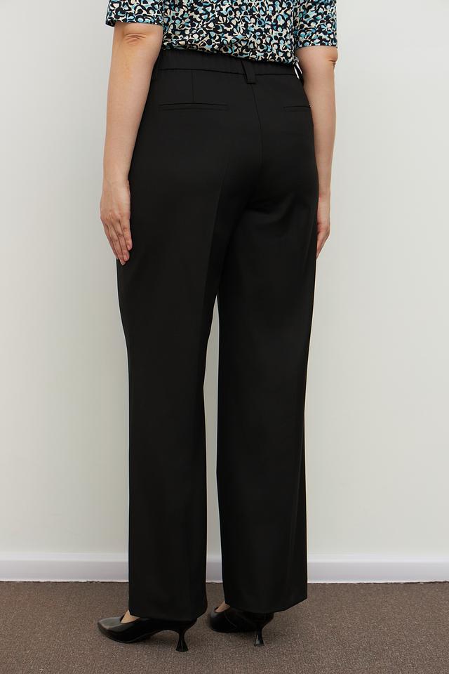 Брюки имеют прямой крой, который визуально вытягивает силуэт и подходит для любого типа фигуры. Высокая посадка обеспечивает комфортную посадку по талии. Застежка на молнию и пуговицу, а также наличие классических карманов по бокам и сзади.