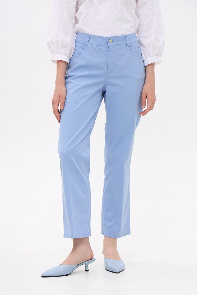 Модель имеет классический крой, пояс с шлевками и пять функциональных карманов. Застежка — молния и пуговица. Цвет — нежный голубой.