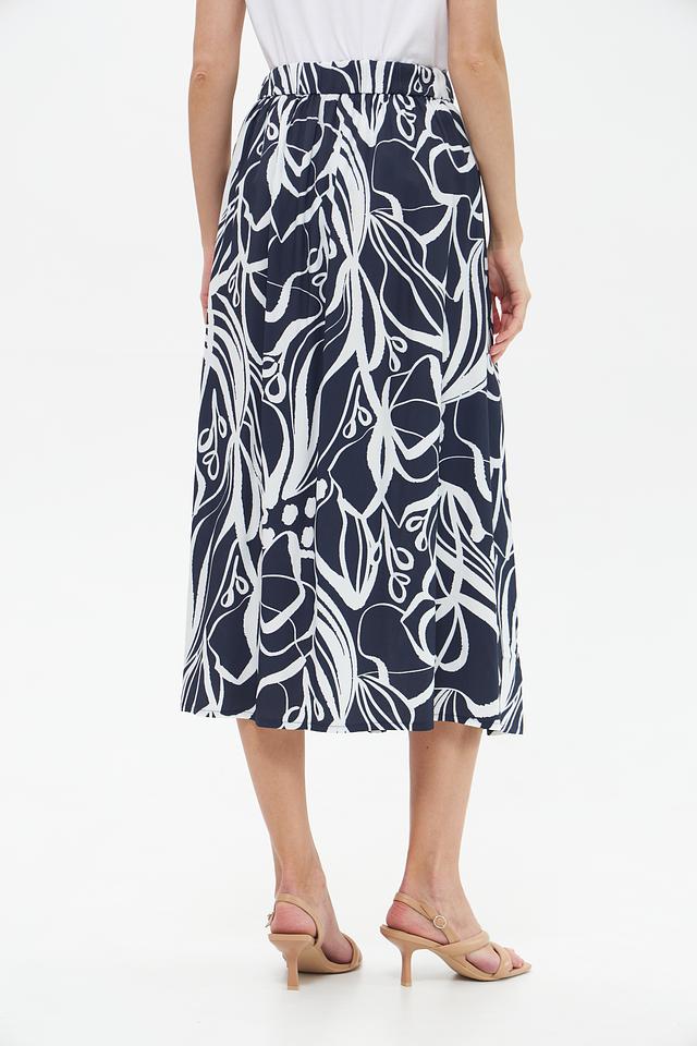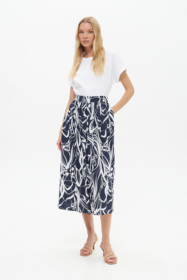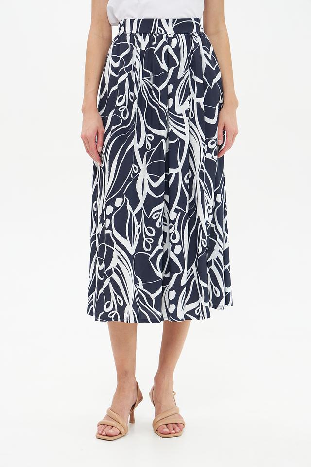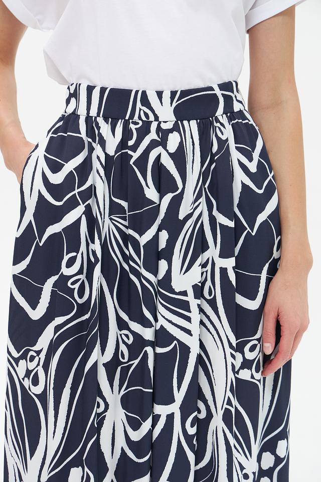Юбка имеет высокую посадку и свободный крой, обеспечивающий комфорт и свободу движений. Декорирована эффектным принтом в виде стилизованных растительных элементов синего и белого цвета.