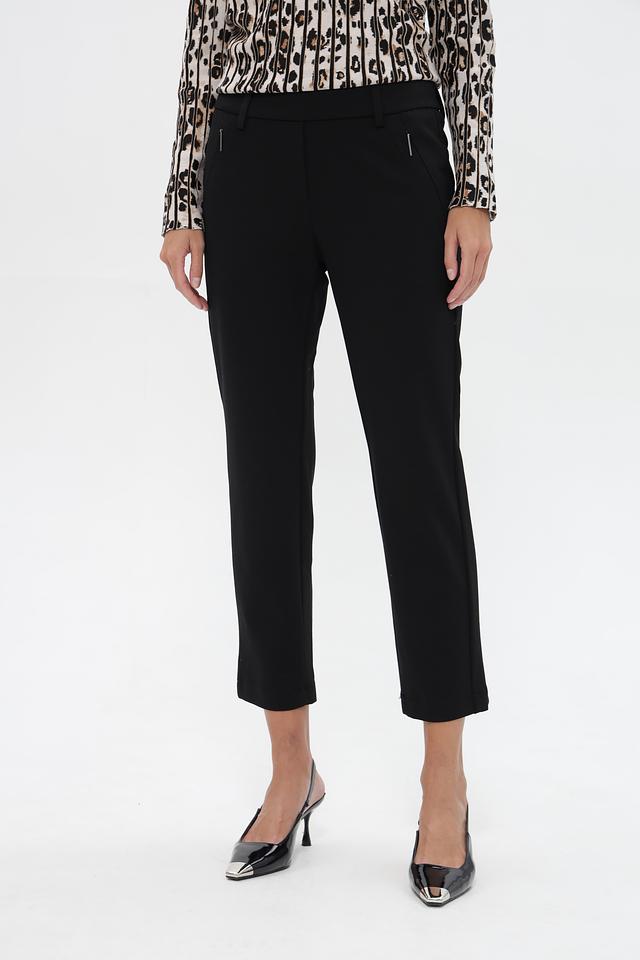 Брюки имеют прямой крой и укороченную длину, что придает им современный вид. Пояс на резинке обеспечивает комфортную посадку по фигуре. Наличие боковых карманов добавляет практичности.