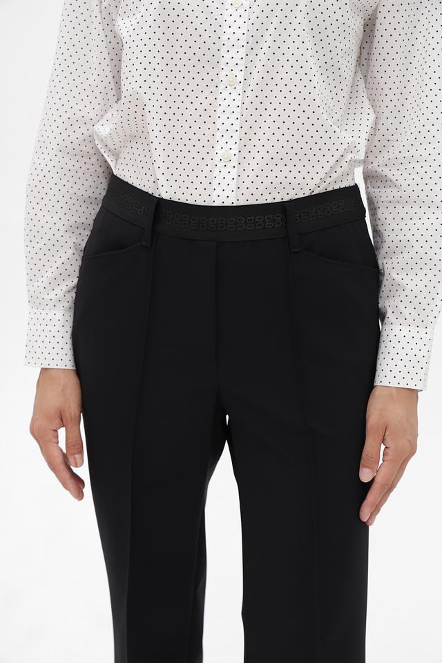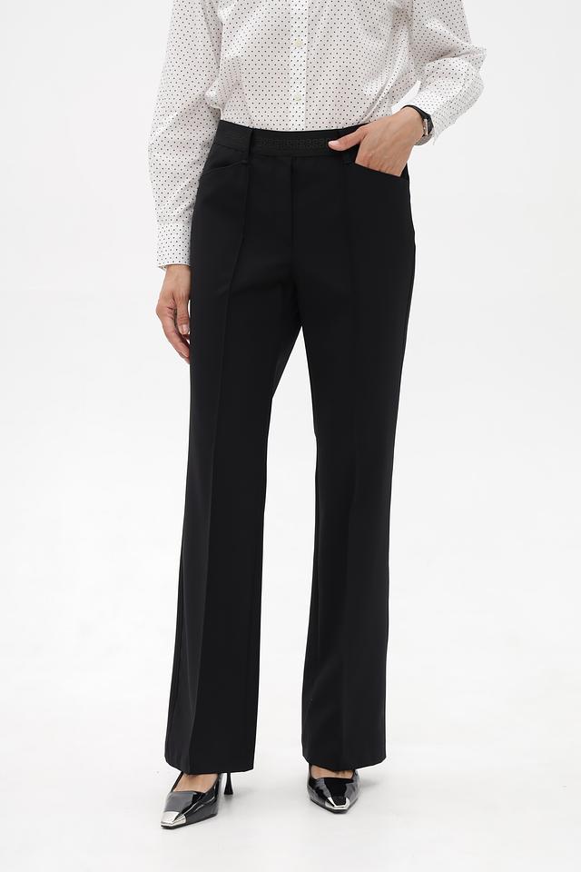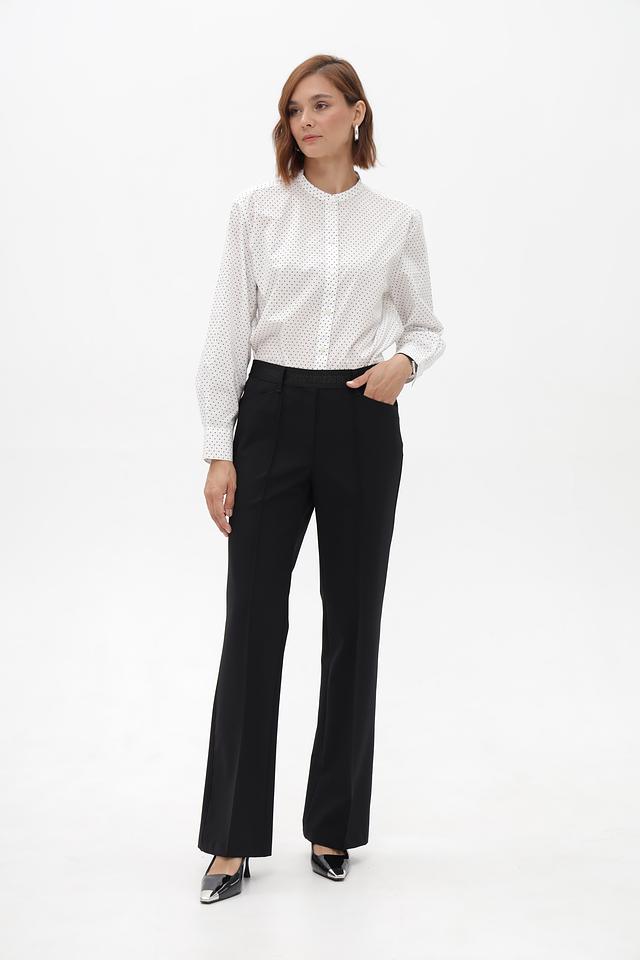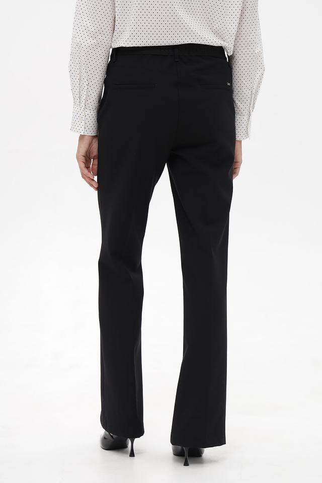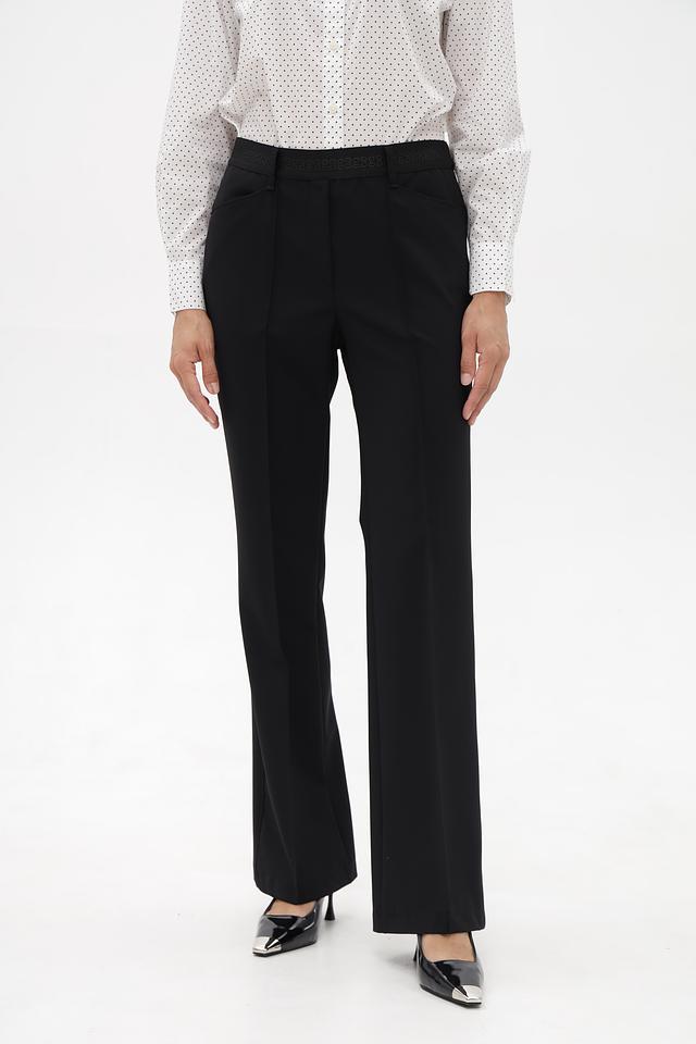 Брюки имеют прямой крой и стандартную посадку по талии. Особенности дизайна включают в себя пояс с эластичной вставкой, обеспечивающей дополнительный комфорт, а также аккуратные складки спереди, придающие образу элегантность.