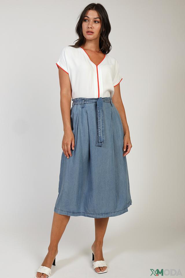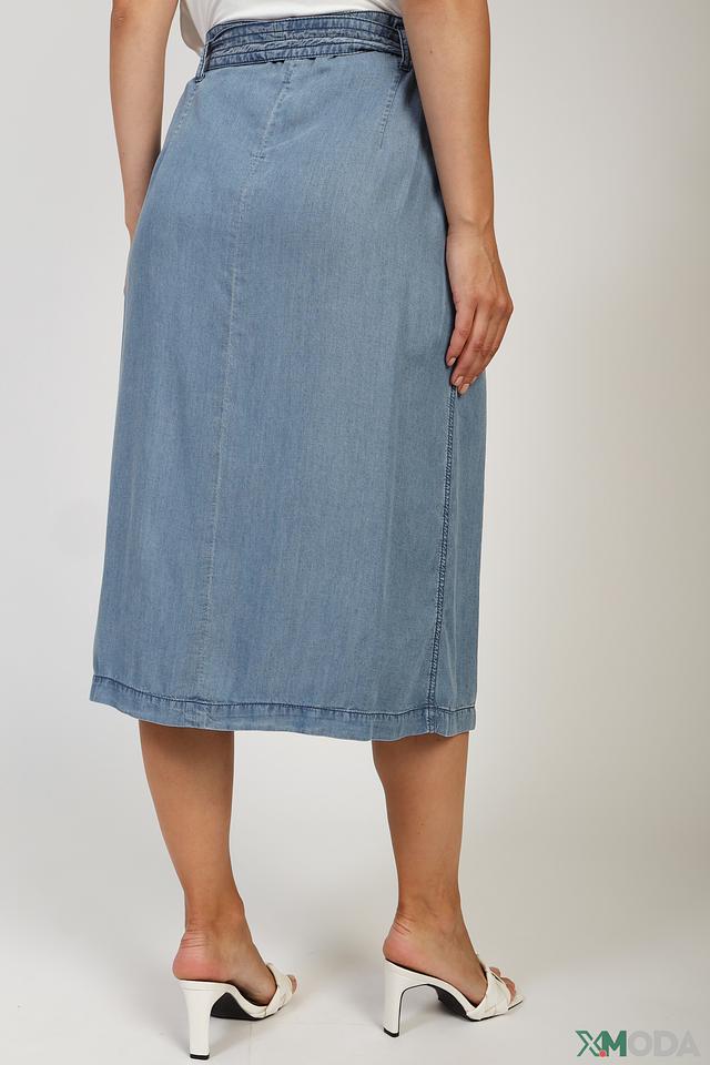 Юбка имеет классический деним-вид, но благодаря мягкой текстуре лиоцела, она ощущается гораздо комфортнее, чем обычный джинс. Модель выполнена в светло-голубом цвете, который легко сочетается с различными элементами гардероба.