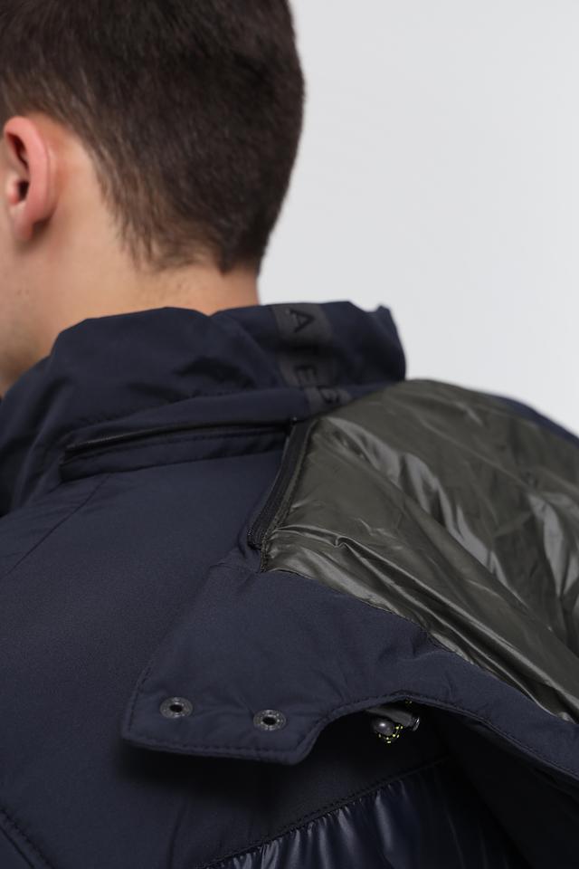 Куртка имеет стеганую фактуру, которая придает ей особый шарм. Комбинированный дизайн с гладкими и матовыми элементами делает ее визуально интересной. Капюшон обеспечивает дополнительную защиту от ветра и непогоды.