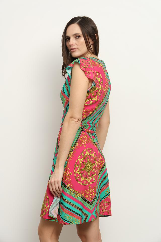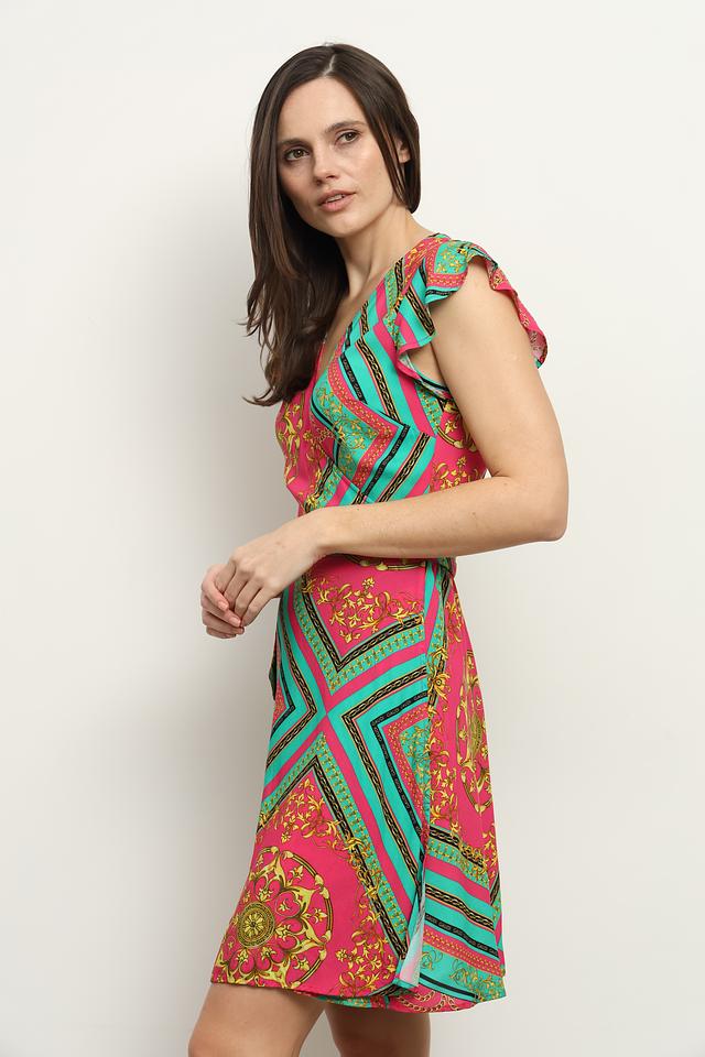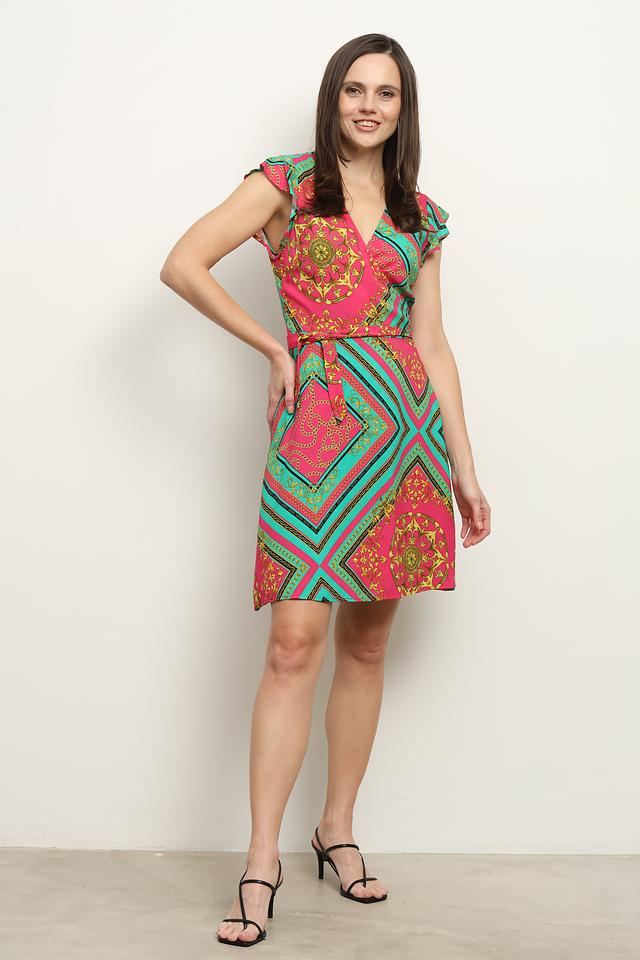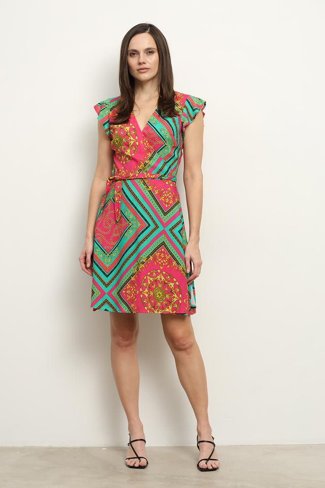 Платье имеет яркий геометрический принт, сочетающий в себе оттенки розового, зеленого, желтого и голубого. V-образный вырез подчеркивает линию декольте, а короткие рукава-воланы придают образу легкость и романтичность.