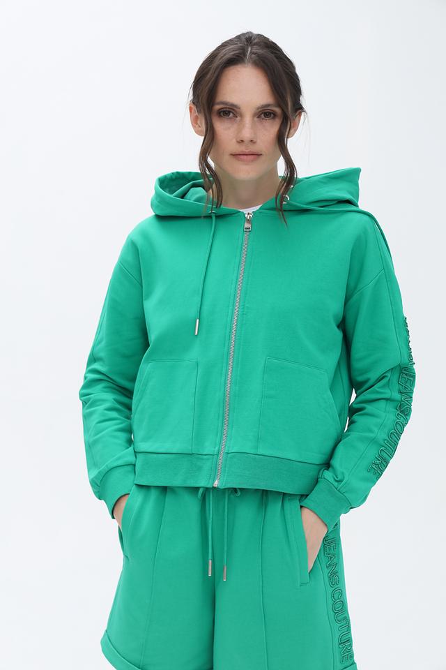 Толстовка имеет удобный капюшон и застёжку-молнию во всю длину, что позволяет регулировать степень тепла. Боковые карманы добавят функциональности. Дизайн дополнен надписями "GAUDI JEANS COUTURE" на рукавах, что придаёт изделию узнаваемый стиль.