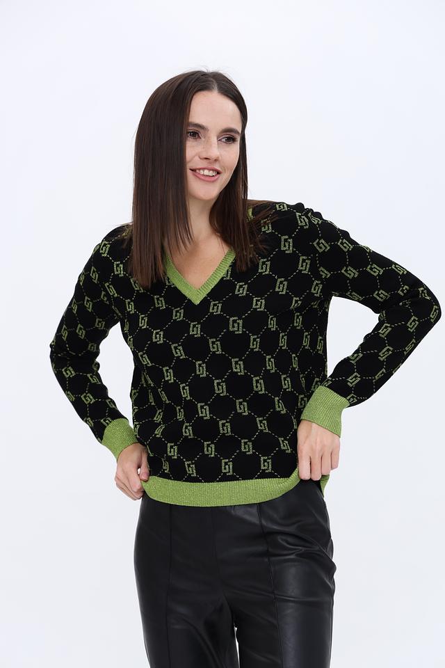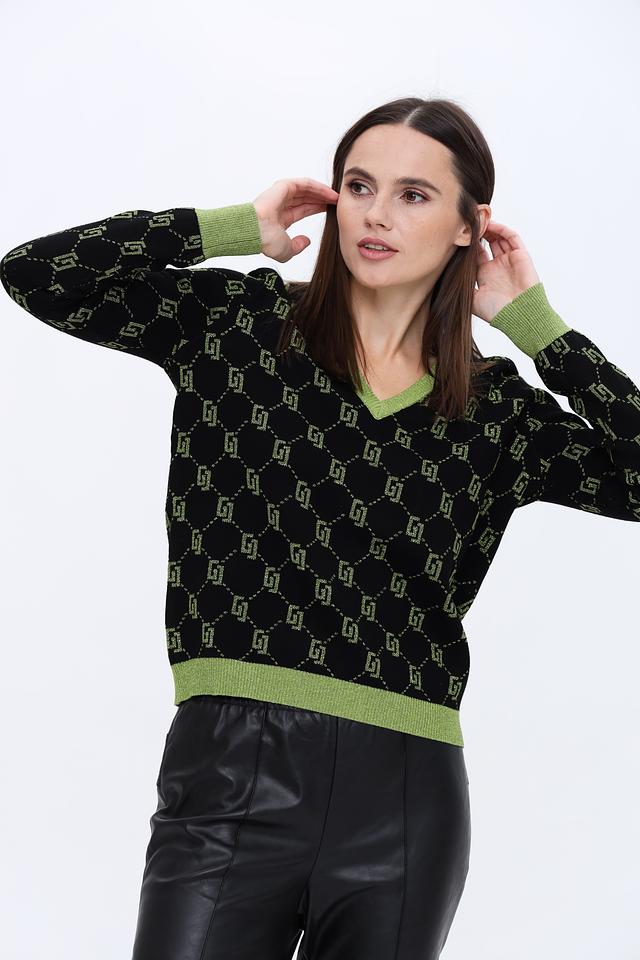 Женский джемпер Gaudi зеленого цвета с V-образным вырезом и геометрическим узором. Изготовлен из мягкой вискозы с добавлением полиэстера и эластана для комфорта и хорошей посадки. Состав: вискоза 53%, полиэстер 31%, эластан 16%