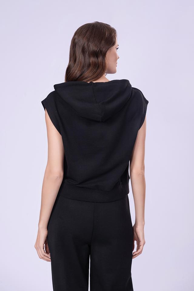 Модель имеет капюшон со шнурками, украшенными стразами, что добавляет образу изысканности. Отсутствие рукавов делает жилет универсальным элементом гардероба, который можно сочетать с различными видами одежды.