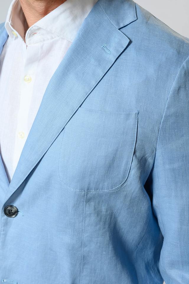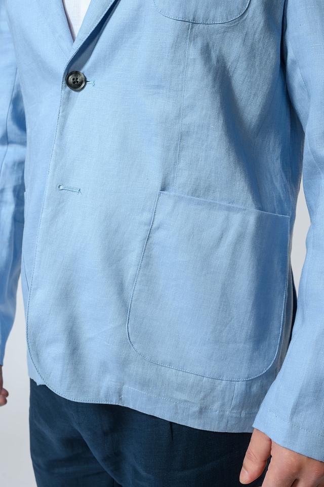 Пиджак имеет классический крой, однобортную застёжку на пуговицу и стандартную длину рукава. На левой стороне груди расположен накладной карман с клапаном, добавляющий пиджаку функциональность и стиль. Отсутствие подкладки делает пиджак более лёгким и удобным в носке.