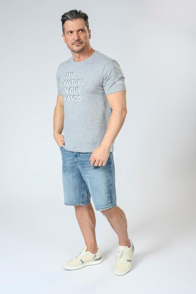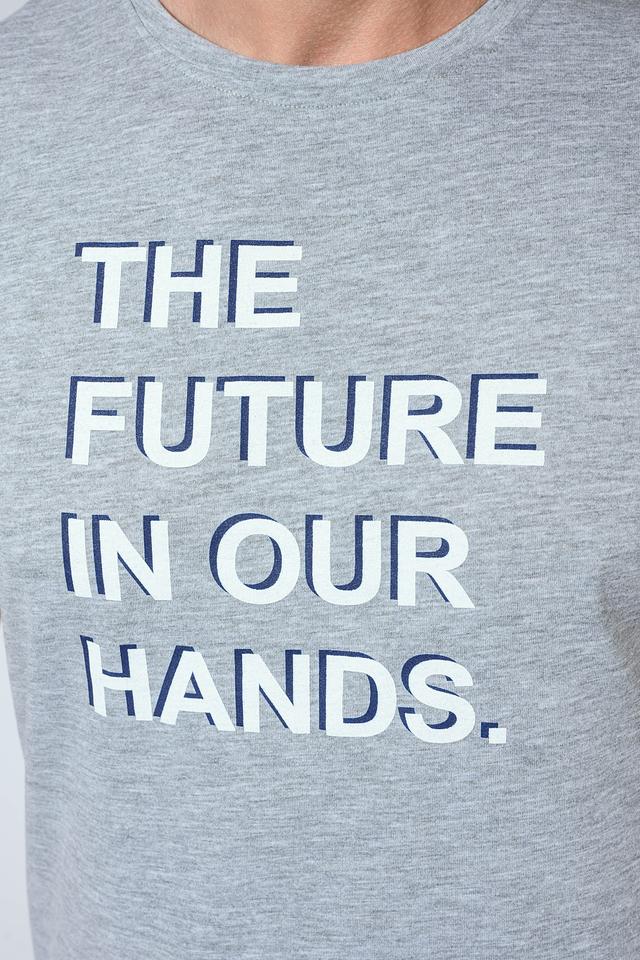 Мужская футболка Gaudi серого цвета с надписью "THE FUTURE IN OUR HANDS". Изготовлена из 100% хлопка, обеспечивающего комфорт и воздухопроницаемость. Стильный и лаконичный дизайн. Состав: хлопок 100%