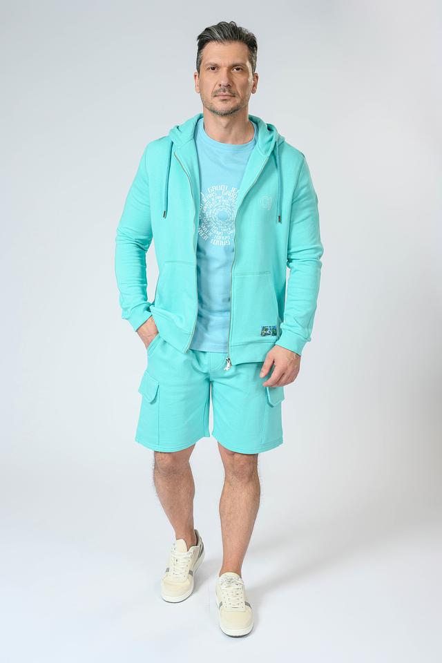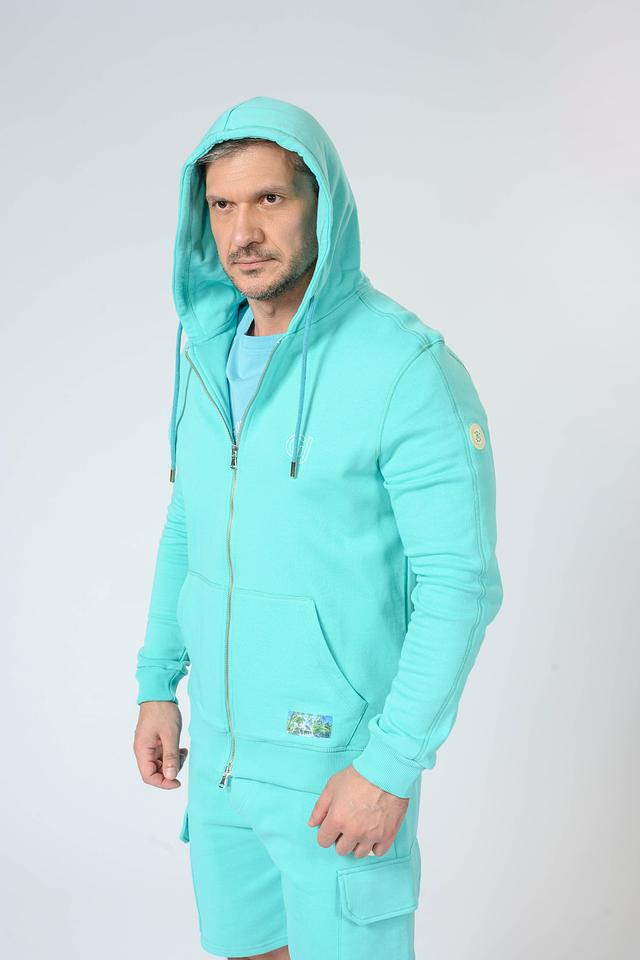 Мужской кардиган от бренда Gaudi выполнен в приятном голубом цвете. Модель застегивается на молнию, имеет капюшон со шнурками для регулировки. На груди расположен вышитый логотип бренда.