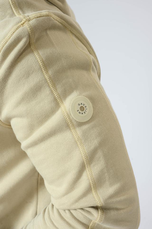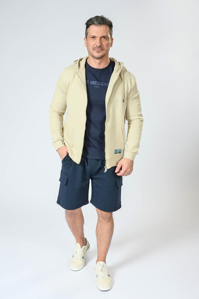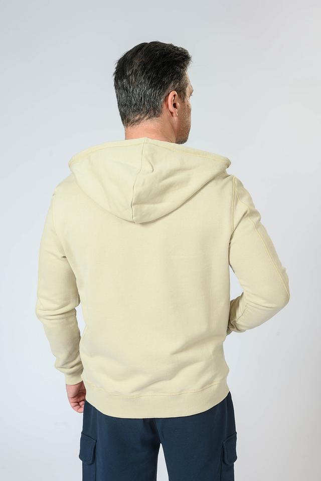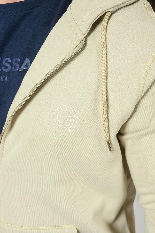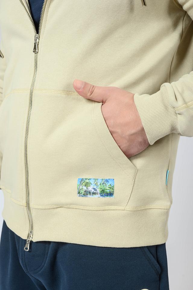 Мужской кардиган от бренда Gaudi выполнен в бежевом цвете. Модель имеет удобную застежку-молнию и капюшон, что делает ее практичной и универсальной.