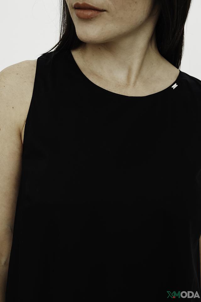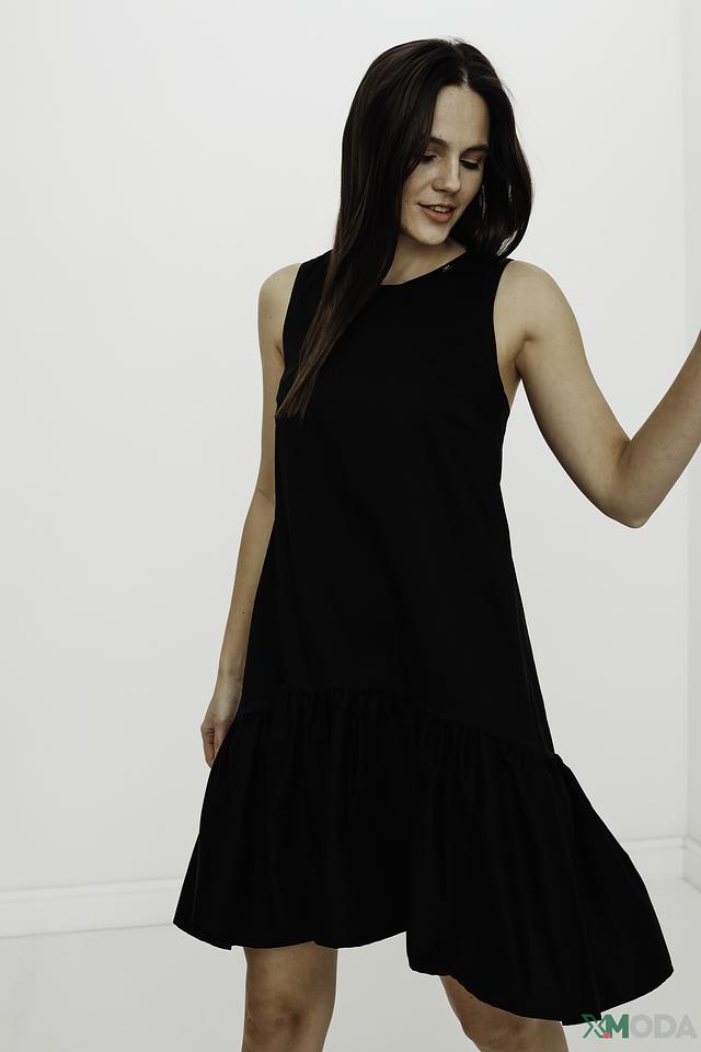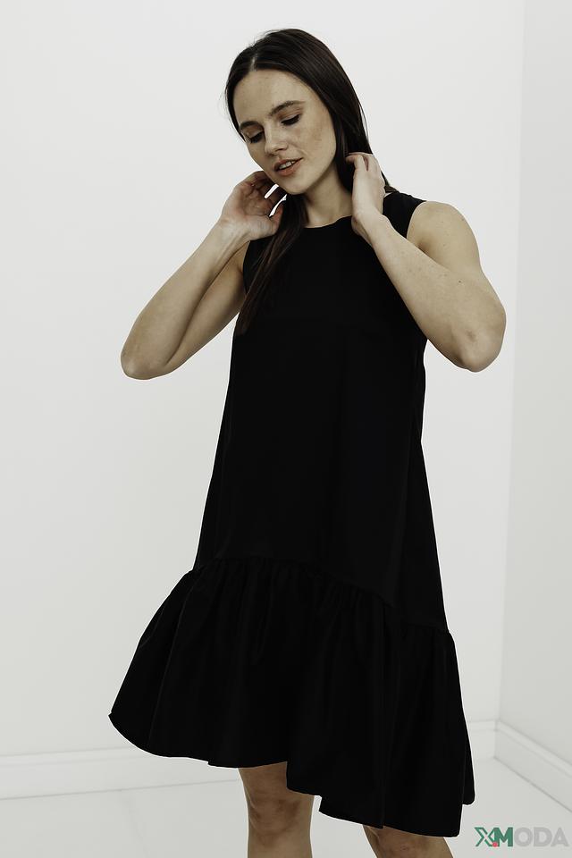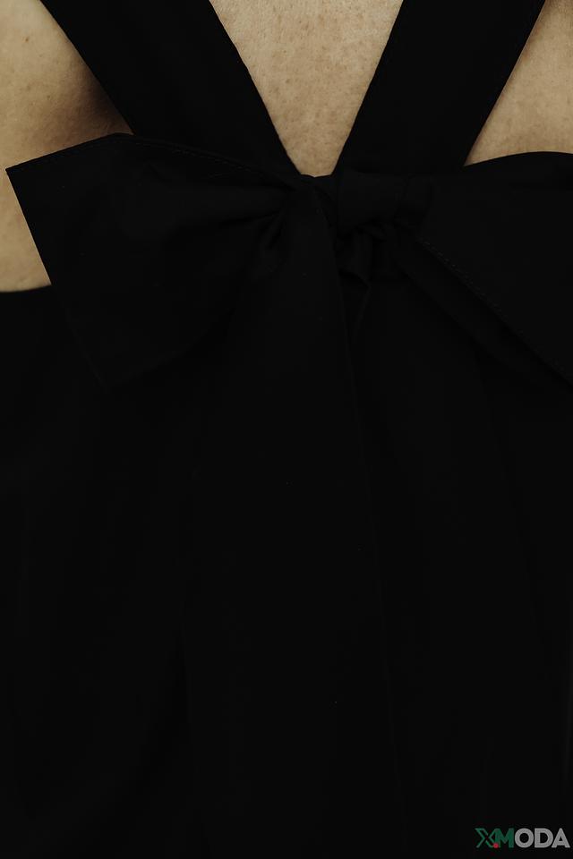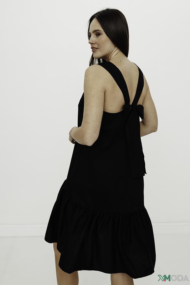 Платье имеет свободный крой, который обеспечивает комфорт в носке. Оборки на юбке придают образу лёгкость и женственность. V-образный вырез на спине дополнен завязками, позволяющими регулировать посадку.